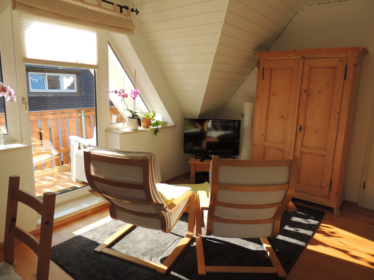 Alquilamos nuestra amplia habitación para no fumadores en el ático recién construido de nuestra casa, con vestíbulo, ducha/WC, televisión por cable, cocina americana (hervidor de agua), cafetera, microondas y nevera pequeña. Proporcionamos vajilla, pero no hay posibilidad de cocinar. Adecuada para hasta cuatro adultos, cuna disponible bajo petición. Comercios, piscina Titania y transporte público cerca.