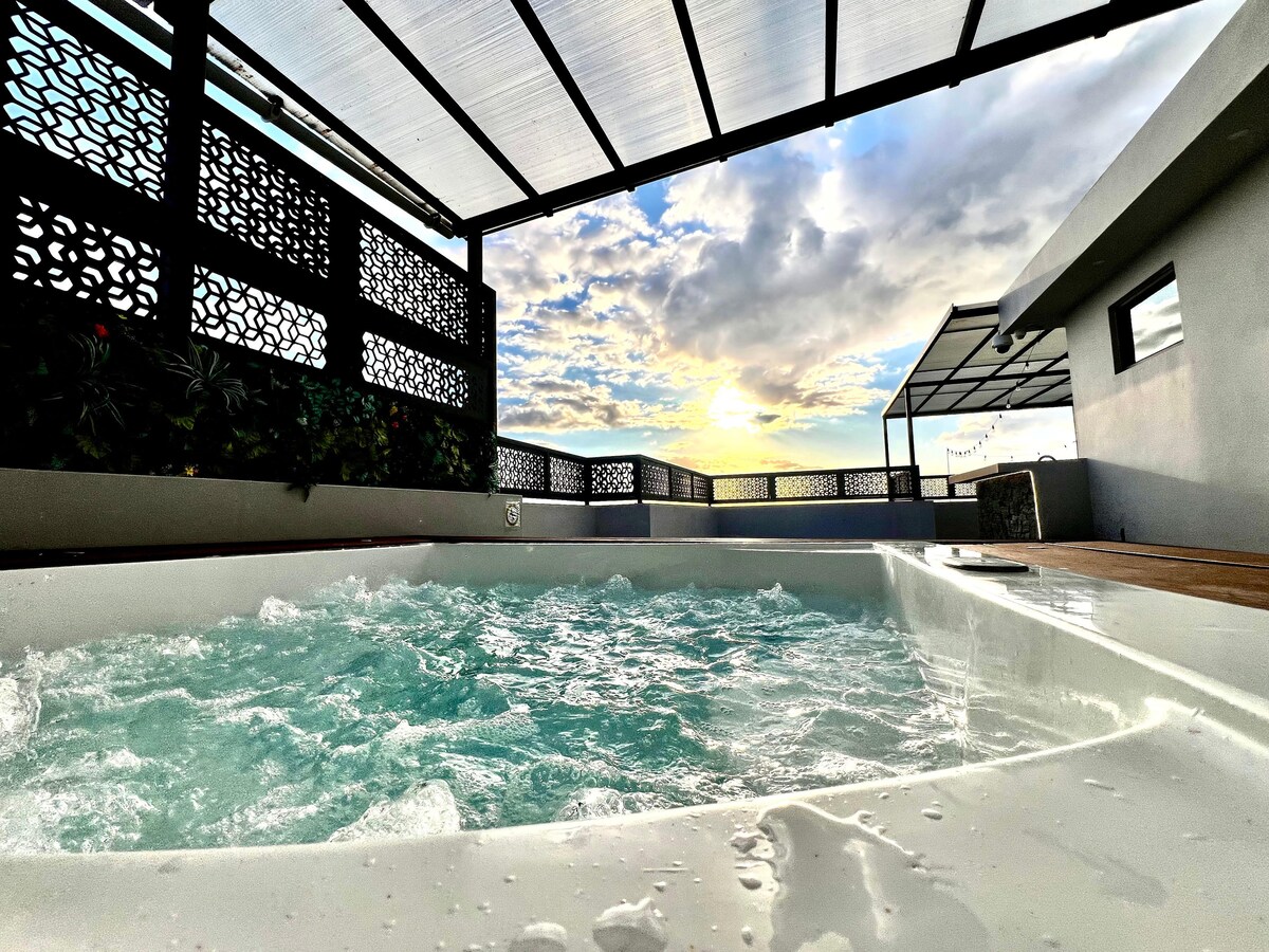 Experimenta la vida de lujo en este espacioso refugio de 2 dormitorios con una impresionante azotea PRIVADA con un magnífico jacuzzi y vistas panorámicas al mar. Con el estilo de un ático elegante, cuenta con interiores elegantes, sala de estar de planta abierta y ventanas del piso al techo que inundan el espacio de luz. Perfecto para parejas o grupos pequeños que buscan comodidad, estilo y puestas de sol inolvidables. A pocos minutos de la playa, los restaurantes y la vida nocturna, tu escapada de ensueño te espera.