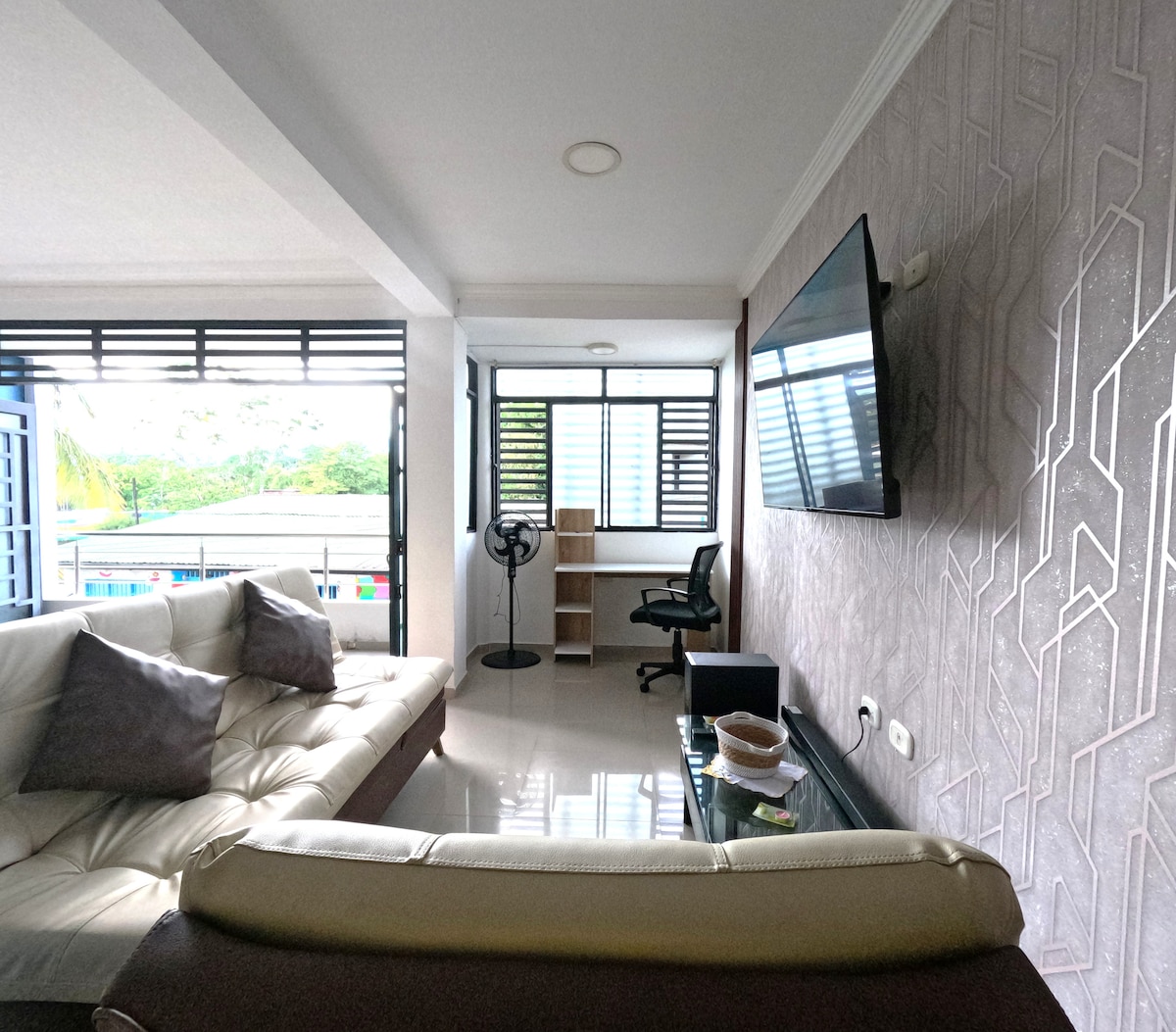 Apartamento estudio con Aire acondicionado amplio elegante, tranquilo, fresco por naturaleza, excelente iluminación natural, no encerrado tiene ventanas que dan hacia la calle y también otra hacia la parte trasera de la casa, además tiene un balcón que da hacía la calle, concepto abierto, la cama es de 160 CM colchón semi ortopédico más un sofá cama, escritorio de trabajo TV Smart TV, lavadero y tendedero de ropa. cocina con sus elementos necesarios y nevera.