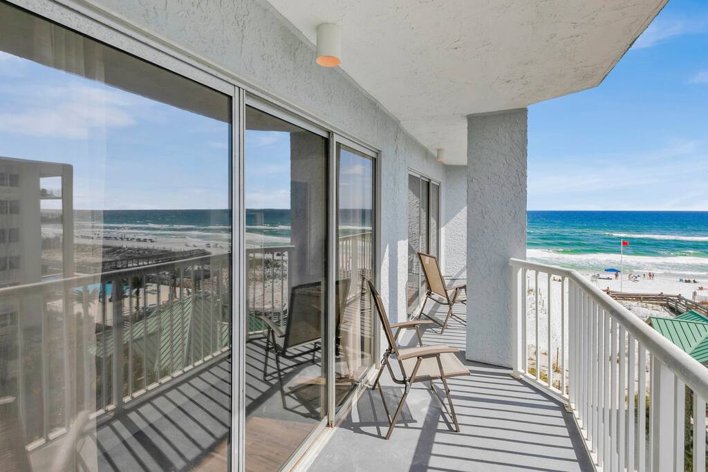 Condominio en el quinto piso directamente en la playa más hermosa del mundo. Condominio totalmente equipado ubicado en Emerald Beach Resort. Ubicado a menos de 1 milla de Pier Park. Unidad de 1 dormitorio/2 baños, capacidad para 7 personas. **Nota: Debe tener 25 años o más para alquilar - Unidad del quinto piso - Amplio balcón frente al mar. - 1 dormitorio / 2 baños / literas /sofá cama tamaño queen /cama individual - 3 piscinas al aire libre y jacuzzi. - 2 televisores LCD de pantalla plana/ cable - Wifi de alta velocidad - Cocina completa - Ropa de cama / toallas proporcionadas - Estacionamiento de garaje.