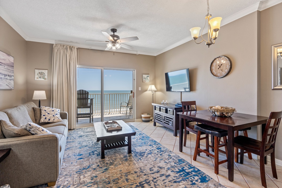 ¡Esquina de lujo actualizada con 1 cama/1 baño frente al mar! Suelos de baldosas por todas partes, dormitorio privado con cama tamaño king, literas (individuales pequeñas) en el pasillo, sofá cama tamaño queen. Cocina totalmente equipada con electrodomésticos nuevos. ¡Balcón de esquina cubierto frente al mar con parrilla! ¡A 3,50 millas de la playa! Restaurantes, vida nocturna, cine, puerto deportivo con barcos/cruceros de alquiler, sala de juegos, noria, tiendas, el Wharf Ampitheater, la piscina del centro vacacional Oasis con piscina de olas, río lento, toboganes, jacuzzi y bar/restaurante de temporada en la piscina.