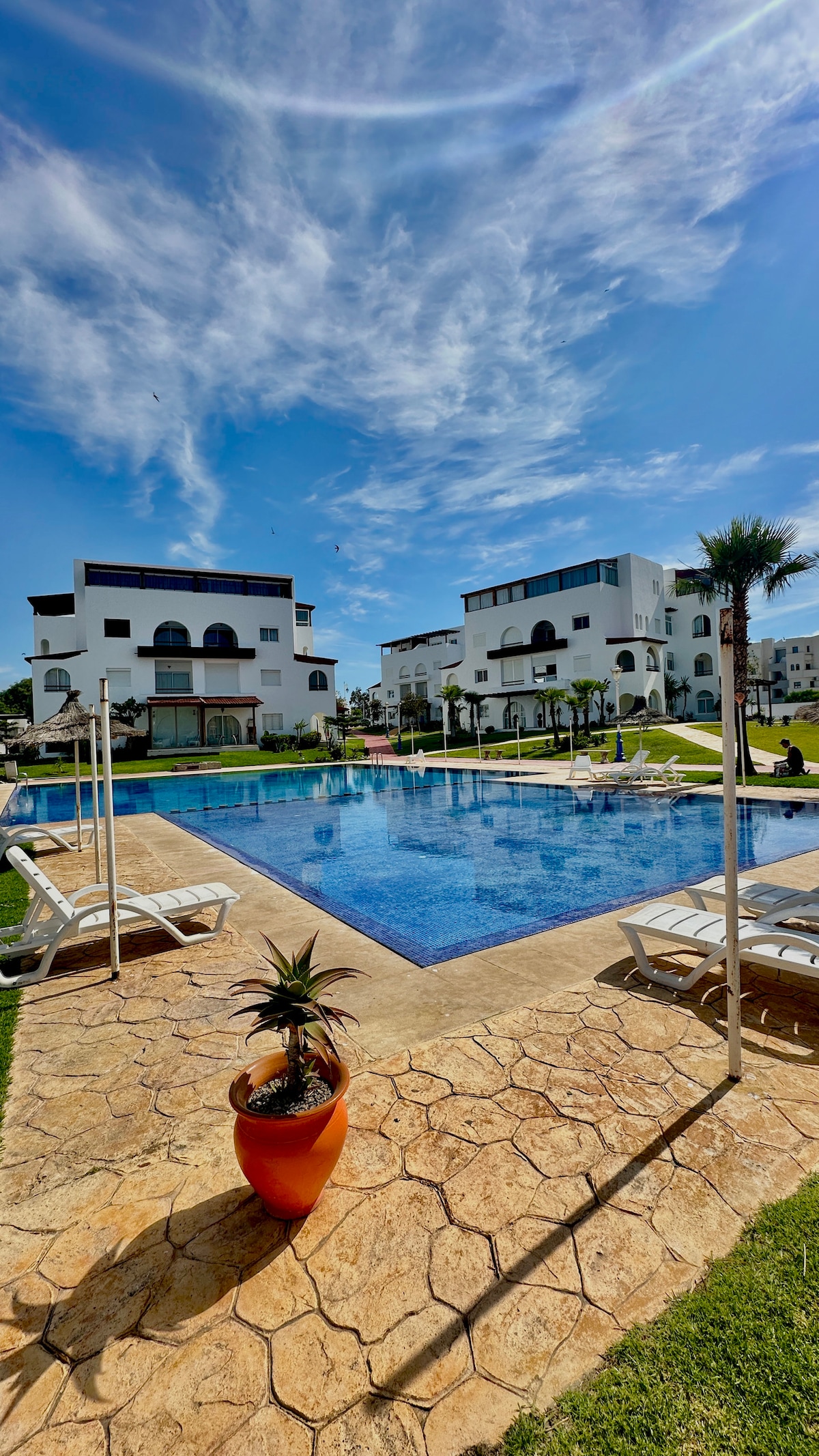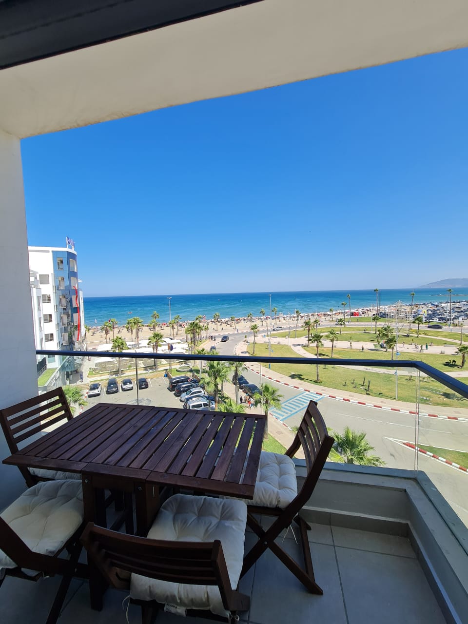 Bienvenido a Marine Escape, un departamento de lujo a solo 2 minutos de las arenas doradas de la playa de Martil. Ubicada en la segura residencia Costa Mar, esta elegante escapada ofrece 2 dormitorios luminosos, 2 balcones privados con vistas panorámicas, 3 piscinas refrescantes y estacionamiento subterráneo. Lo que te encantará: • Acogedora sala de estar, wifi y TV inteligente. • Cocina totalmente equipada (cafetera, microondas...). • 2 dormitorios tranquilos con ropa de cama cómoda. • Baño moderno y ropa de cama incluida. • Acceso sin restricción de horario • Seguridad las 24 horas, 7 días a la