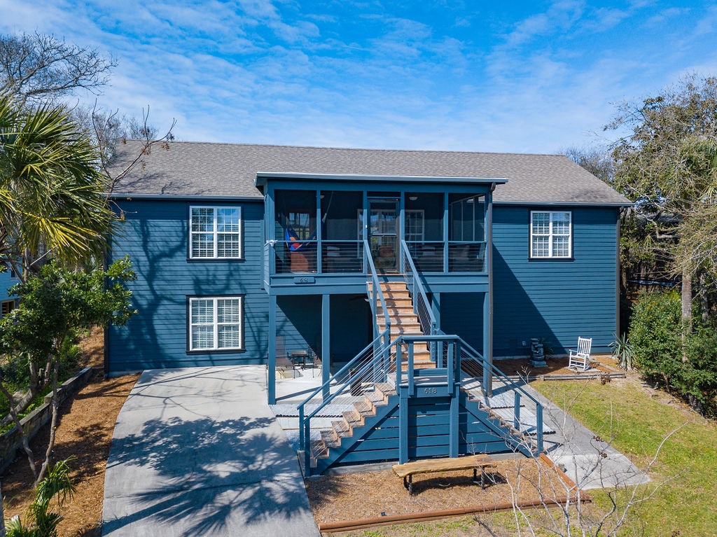 Our home offers some of the most stunning views on Folly! With four private patios, you are ablet to see amazing wildlife in the marsh, see the Intracoastal Waterway, and the Morris Lighthouse. With two king beds, two queen beds, and a bunkbed. Enjoy the hot tub overlooking the marsh, a secluded rooftop room with deck with panoramic views a Golf hitting bay and plenty for kids. This spacious house is full of character, complete with hammocks and outdoor chairs. STR23-0364799CF LIC 20072