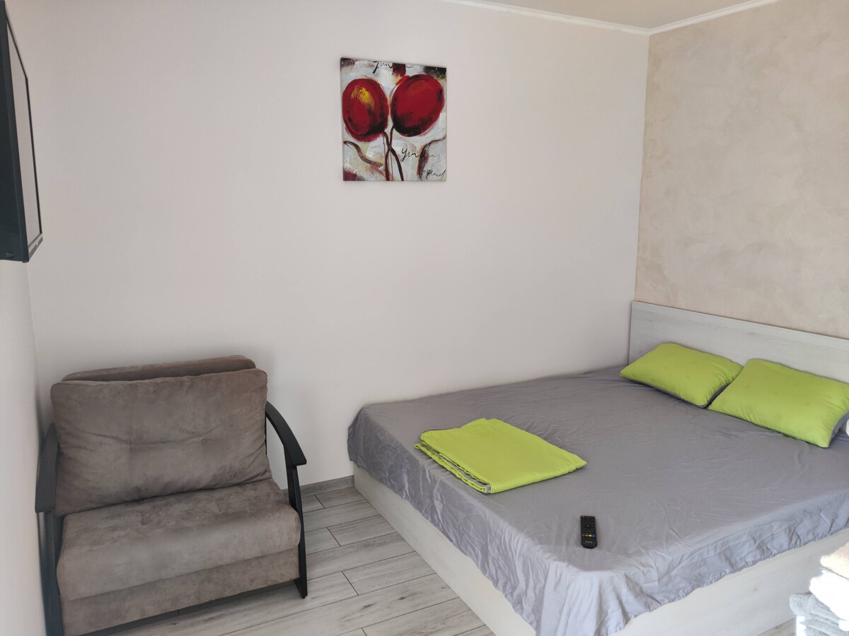 Nuestro alojamiento está diseñado para un descanso cómodo. Se encuentra en una casa nueva y elegante con un interior moderno, Wi-Fi rápido, aire acondicionado y recirculación de aire, y un baño elegante, con secador de pelo y secador de toallas eléctrico. El apartamento tiene un televisor grande de 43 pulgadas, microondas, juego de té, vajilla, nevera con congelador, albornoces, kits de higiene, jabón, champú.