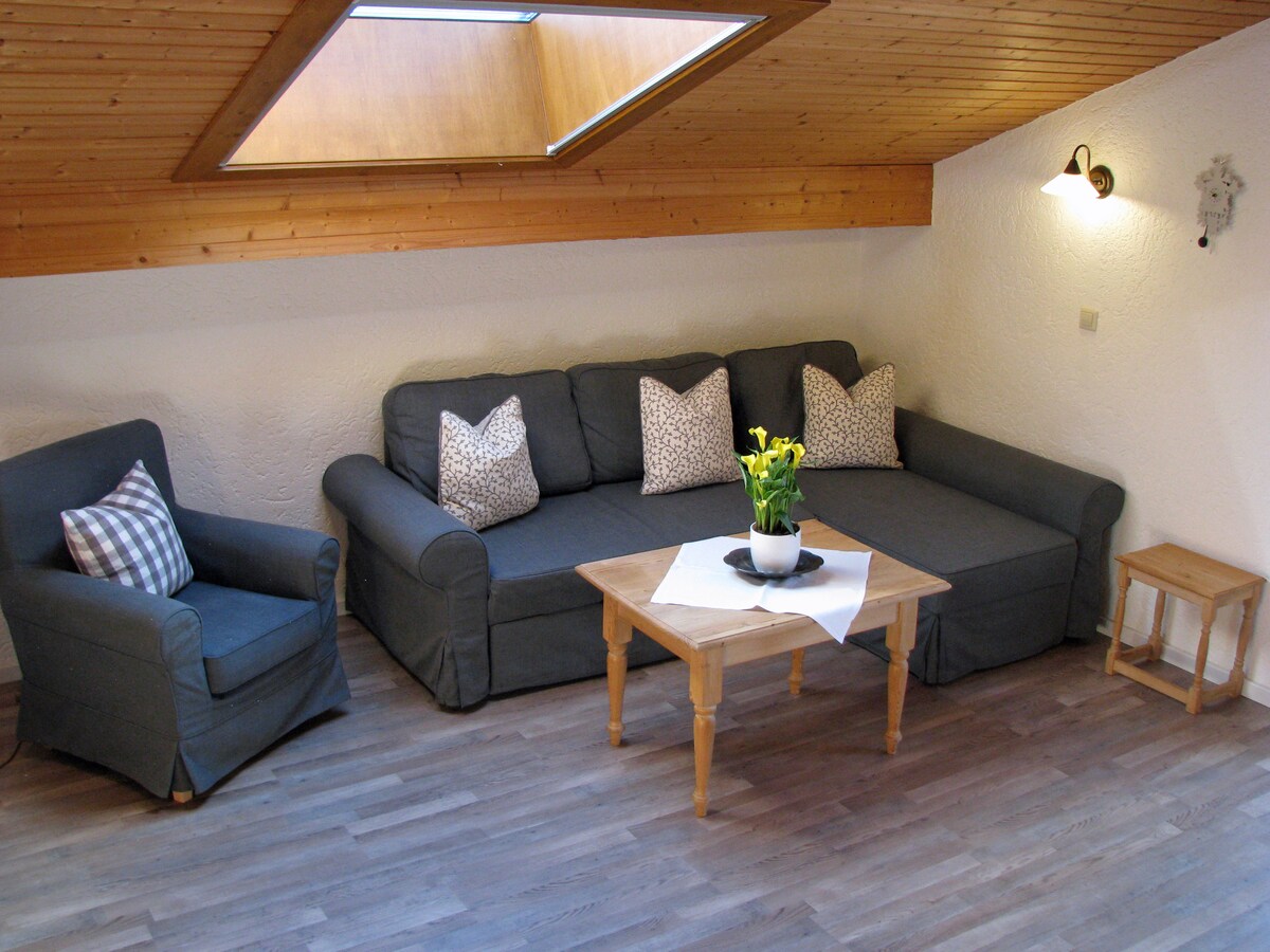 ¡Te damos la bienvenida a Studio Rechenberg #2! Este acogedor estudio tiene capacidad para 4 personas e impresiona por sus características únicas. Ya temprano en la mañana, el sol brilla sobre el Rechenberg a través de las ventanas orientadas al este en la cocina y la sala de estar, mientras que la vista de amplios prados de flores y los Alpes de Chiemgau proporciona relajación.
