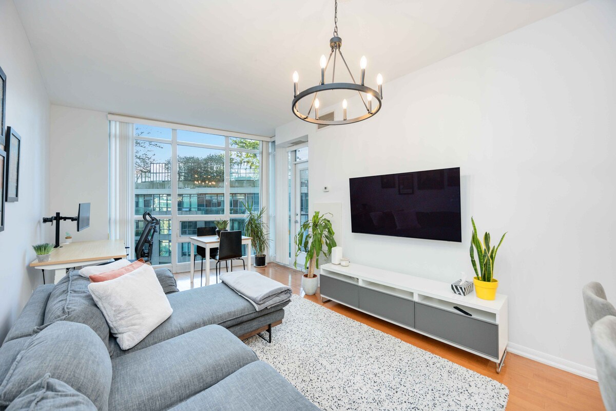 ¡Te damos la bienvenida a Fort York Flat! Este espacio de 2 dormitorios y 1 baño ha sido cuidadosamente renovado utilizando una mezcla de decoración moderna y contemporánea para crear un lugar relajante y de primer nivel para relajarse mientras disfrutas de todo lo que el centro de Toronto tiene para ofrecer. Nuestra ubicación y la caja de seguridad inteligente ubicada en las puertas delanteras hacen que el registro de entrada en el apartamento sea más fácil que nunca, sin necesidad de preocuparse por el personal de recepción o esperar a los ascensores.