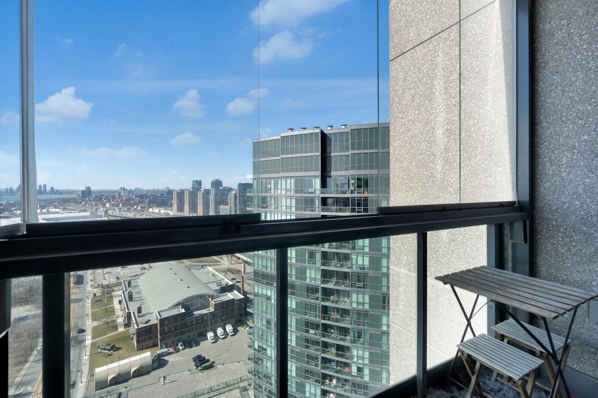 Tu propio apartamento de estudio/soltero con vistas a un lago + todo lo que necesitas para sentirte como si nunca te hubieras ido de casa. Trabaja con una vista impresionante, wifi gigabit rápido y estable, estacionamiento interior, suite con aire acondicionado y calefacción. Despierta con una vista despejada del lago Ontario desde cerca del piso 30. Conéctate con el centro de la ciudad mientras estás cerca de Lake Ontario y Coronation Park. A pocos pasos de la exposición, el escenario Budweiser, el aeropuerto de Porter, la torre CN, Rogers Centre, King St W y Liberty Village.
