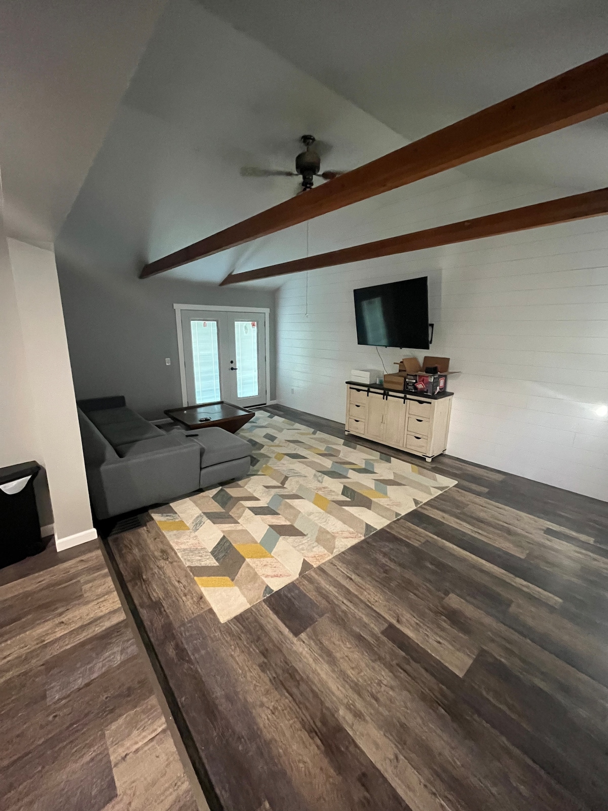 Nuestra cabaña en el bosque es un refugio tranquilo, no un lugar de fiesta. Construido con muchas características únicas: habitación de cabaña de madera con techo abovedado, paredes de madera en la cocina americana/pequeña zona de comedor en la planta superior y pared de madera en el solárium. Puertas de granero estilo carruaje, del antiguo gallinero de los abuelos. La barandilla de la escalera de metal diseñada y cortada con láser con pinos. El sótano de la planta baja tiene vigas y postes de troncos de concreto, así como algunas ramas de árboles de concreto. Los senderos son solo para viajes tranquilos, sin motores.