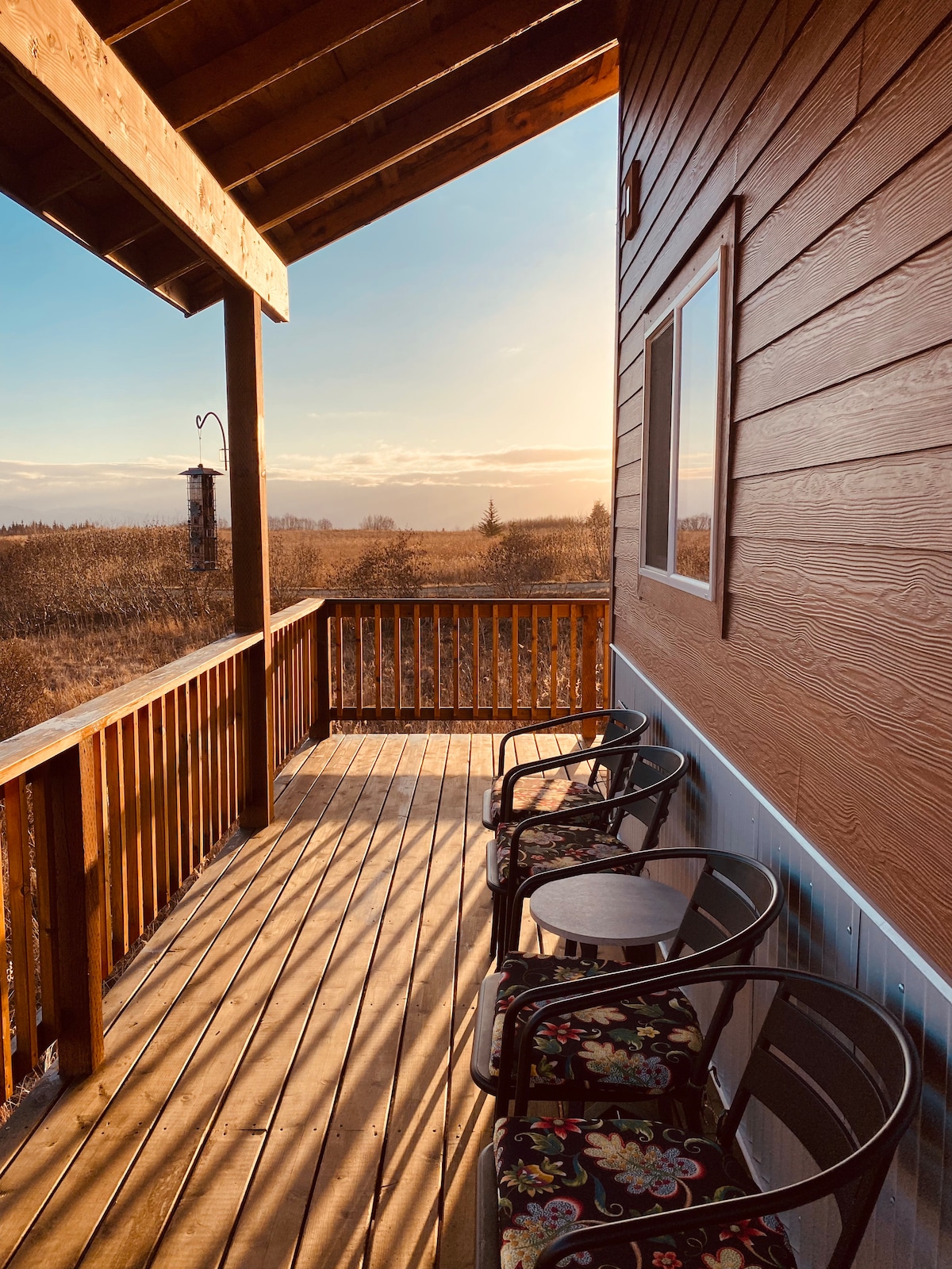Esta sencilla y encantadora cabaña se encuentra en lo alto de un pastizal verde (o blanco o marrón) con vistas a la bahía de Kachemak y a dos caballos mimados. Tiene una sensación tranquila de “fuera de la ciudad”, sin embargo, el Spit y el alojamiento del centro de la ciudad se encuentran a solo 8-12 minutos en auto. ¡Es posible que encuentres huevos frescos de nuestras gallinas en el refrigerador si están produciendo bien! Incluye una cómoda cama tamaño queen, baño completo con lavandería y una cocina pequeña pero capaz. Las estancias más largas aquí son económicas y cómodas.