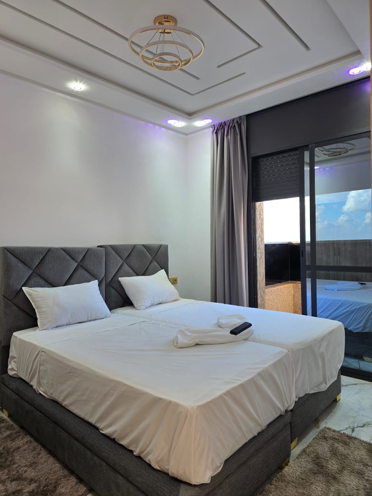 Appartement élégant et entièrement équipé, idéal pour un séjour confortable. Il comprend une chambre avec deux lits pour deux personnes et une salle de bain privée, ainsi qu’une deuxième salle de bain indépendante avec eau chaude. Cuisine équipée avec réfrigérateur, four et machine à laver. Climatisation, salle à manger en bois et salon marocain traditionnel. Deux balcons : l’un donnant sur la rue et l’autre avec vue sur la montagne. TV et connexion Internet incluses.