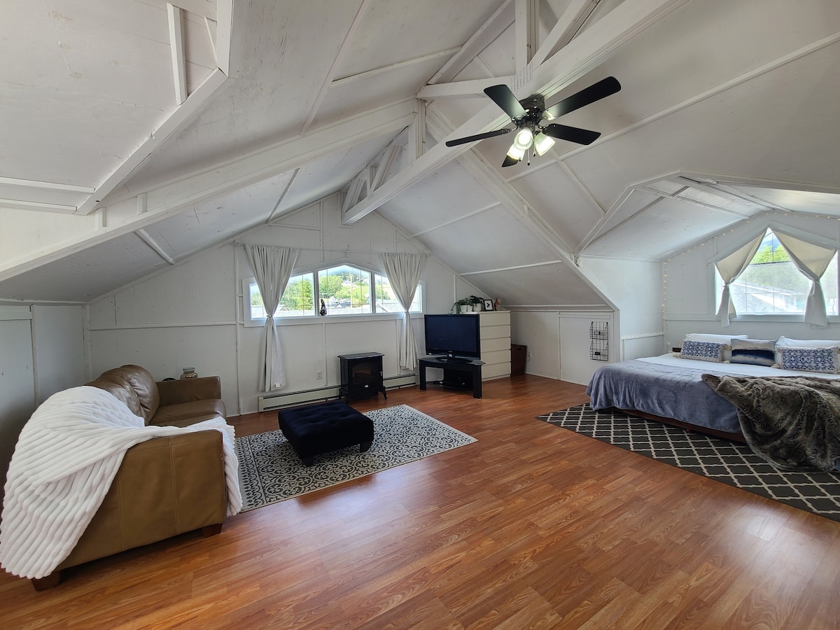 Spacious rustic studio-loft guest house in Coleman, Crowsnest Pass, with a view of Crowsnest Mountain! Rest up in the king size bed (firm mattress) or relax to a Netflix movie on the sofa after a day of adventuring! There is a twin sized cot (surprisingly comfortable!) if two beds are required. We offer driveway parking and a private entrance. The guesthouse is a separate building and shares only a portion of the deck with the main house on the property. Now pet friendly! License #: 0001778