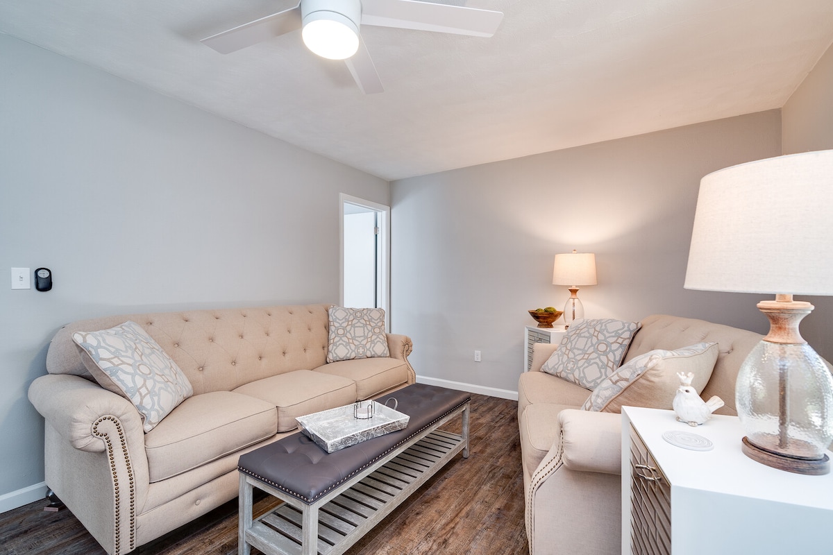 Esta casa de huéspedes de una sola planta con 2 dormitorios y 1,5 baños es perfecta para viajes de trabajo, en grupo, de diversión o visitas familiares. La cocina tiene platos, utensilios de cocina y productos básicos de despensa (aceite, condimentos, azúcar y harina). Se proporciona una cafetera Keurig de una sola porción y una jarra con k-cups y filtros de café. La casa de huéspedes tiene dos salas de estar, un comedor, una cocina, un lavadero con lavadora y secadora, un patio privado con asientos al aire libre y una parrilla.