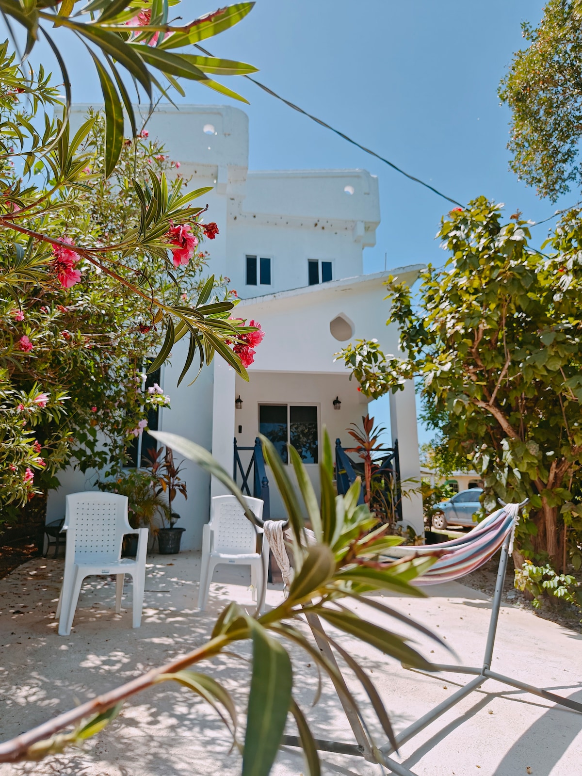 Esta encantadora habitación de la villa tiene techos altos, ventanas extragrandes hechas a mano, puertas dobles personalizadas y un porche cubierto con mosquiteros que agrega una cómoda sala de estar ideal para el trabajo a distancia o simplemente observar al pájaro médico flotando de flor a flor. La lujosa cama queen y el baño en suite recientemente renovado hacen de este acogedor espacio una casa de ensueño junto a la playa. Esta cabaña se enfría con ventilador con ducha de agua caliente. Ideal para fines de semana fuera o para un viajero solo.