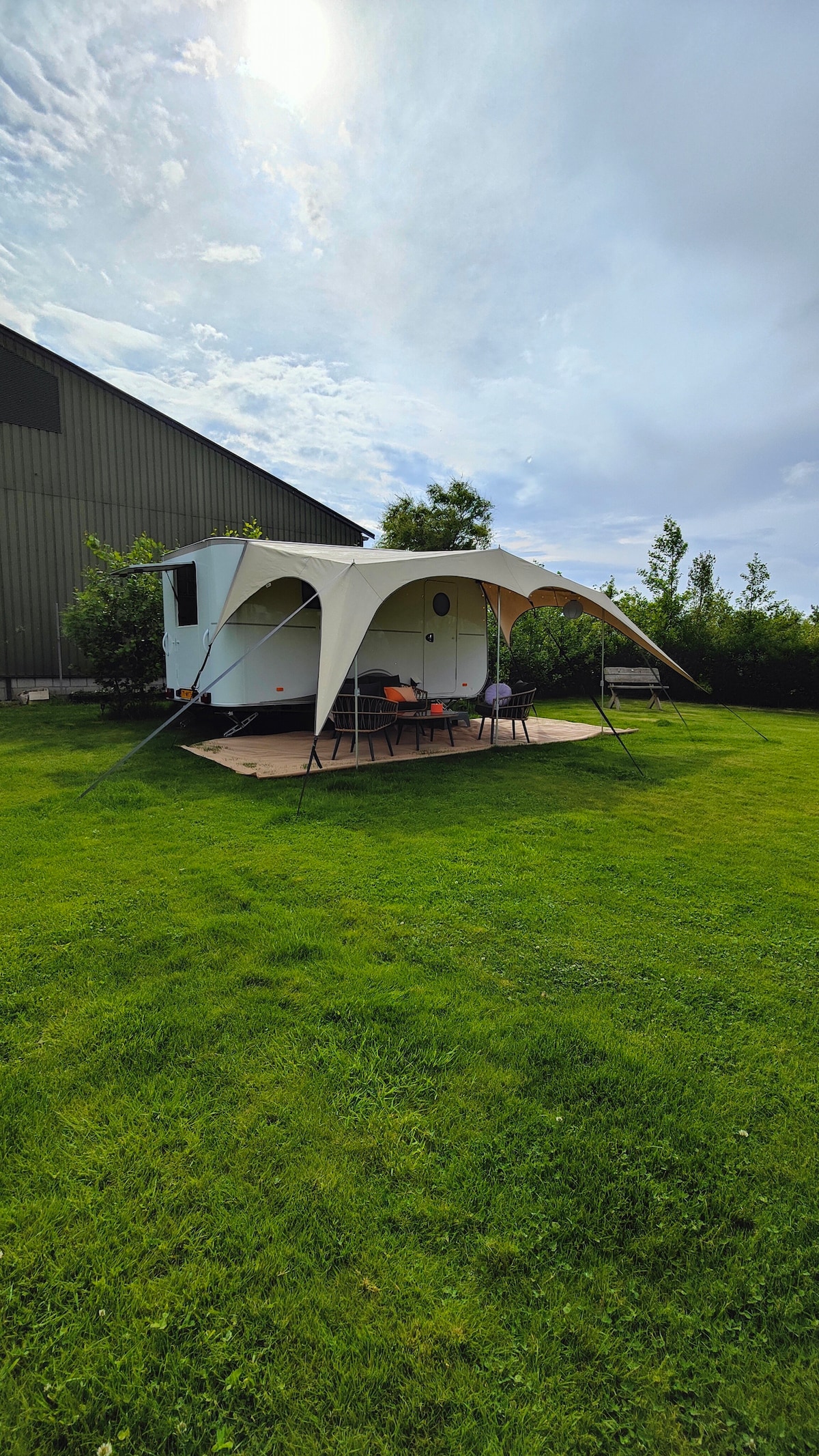 Relájate en nuestro acogedor Beachy. Esta se encuentra en un campo privado en nuestro pequeño camping de granja. Lo único de nuestra caravana es que la puerta trasera se puede abrir y desde su cama (140x200) se puede ver el dique de Wadden. Viene con un edredón de lits-jumeaux de serie. Hay un amplio armario de almacenamiento y en la cocina encontrará una nevera, hervidor de agua y Nespresso. Se proporcionan toallas. Usted utiliza el sanitario general.