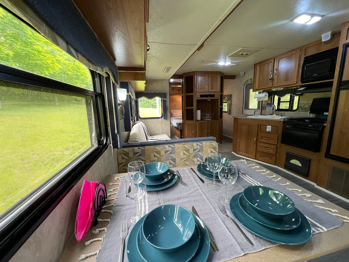 Remolque moderno y limpio con vistas al agua dentro de un pequeño camping familiar. Totalmente equipado con energía y agua. Si bien el inodoro se ha desactivado dentro del remolque, las modernas instalaciones del baño están a solo unos pasos e incluyen inodoros, urinales, lavabos, espejos y duchas de agua caliente. Para cocinar, puedes usar la estufa, el horno, la chimenea exterior o la barbacoa de gas. Proporcionaremos las ollas y los utensilios. TRAE: almohadas, ropa de cama, mantas, toallas, paños de cocina/té, aceite para cocinar, especias, comida.