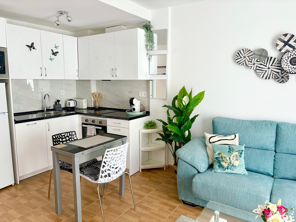Disfruta de un apartamento totalmente reformado en una ubicación perfecta. El apartamento se encuentra en un edificio con ascensor, jardines, piscina y zona de trabajo Aprovecha su cercanía a la playa y el sol de la terraza. La parada del tren se encuentra a 5 minutos a pie como los supermercados, cafeterías, farmacia, restaurantes, bares... *Si vienen 2 necesitan especificar si necesitan ropa de cama en el sofá cama. *Para estancias de más de 3 semanas se paga luz aparte.