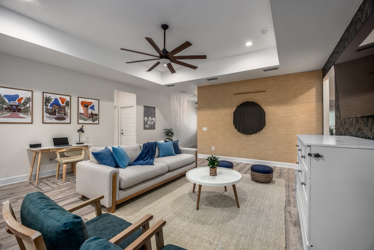 RECIENTEMENTE RENOVADO: disfruta de tu estancia en Gainesville en este moderno estudio de mediados de siglo a 0,5 millas de UF y a 2 millas de los hospitales UF y HCA. No se pasó por alto ningún detalle en esta casa de huéspedes independiente bellamente diseñada con abundante luz natural, acabados exclusivos y un sinfín de comodidades: cocina pequeña, mininevera/congelador, TV inteligente y mucho más. Este espacio privado y tranquilo convenientemente ubicado en el corazón de Gainesville es perfecto para cualquier persona que visite por solo una noche o unas semanas.