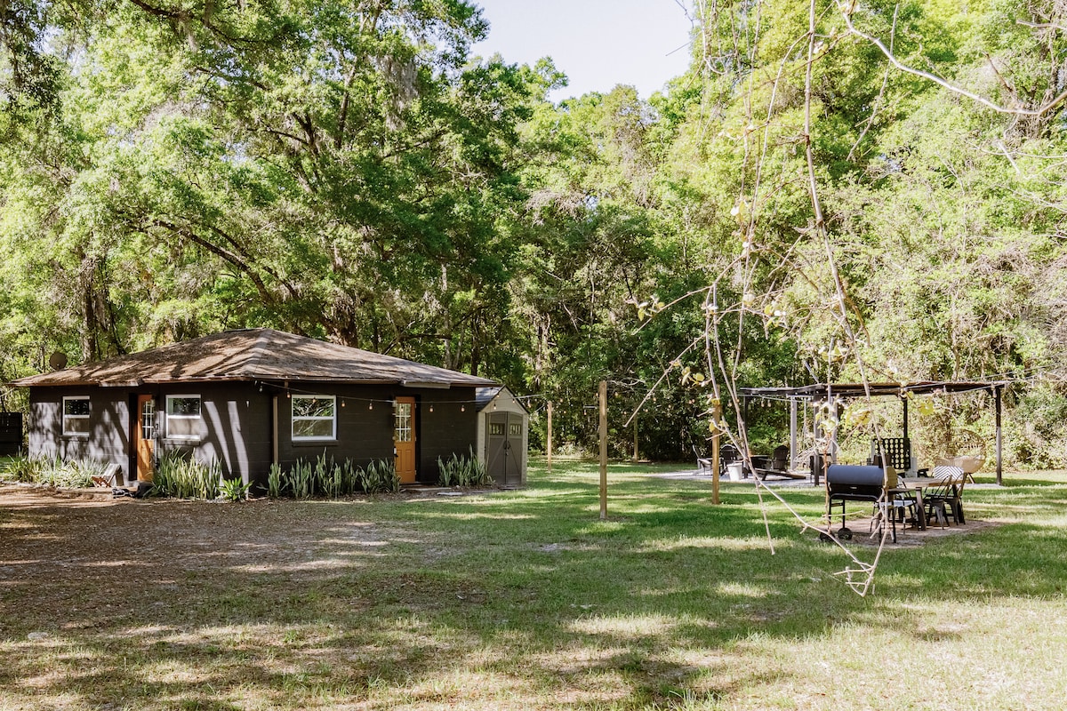 Crazy Oaks Cottage está fuera de lo común, pero a pocos minutos en coche de todo lo que ofrece Gainesville. La casa está en un acre, enclavada en el bosque. Al otro lado de la carretera hay una hermosa granja de caballos, mantenida por la UF. Estamos cerca de hospitales y del campus de la UF. ¡Nuestra zona es conocida por una gran variedad de especies de aves! Con muy poco tráfico en la carretera, es perfecto para nuestros huéspedes con perros. Las vistas de la mañana son brumosas y tranquilas, y es posible que veas los ciervos que frecuentan nuestro patio. ¡Vuelve a casa con Serenola Hammock!