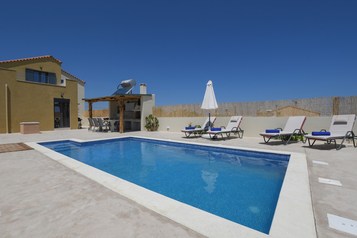 Sapphire house with a private hot tub offers the perfect blend of luxury and meticulous detail, welcoming you to an unforgettable stay! The private yard is the ideal place to enjoy your favourite drink near the hot tub, while gazing upon the magnificent sunsets of the Aegean Sea. Explore nearby sandy beaches such as Arina (4km), Amnissos, and Kraterou (both 8km), and then unwind by the poolside oasis. Plus, enjoy hassle-free parking right on the premises. Your dream holiday starts here!