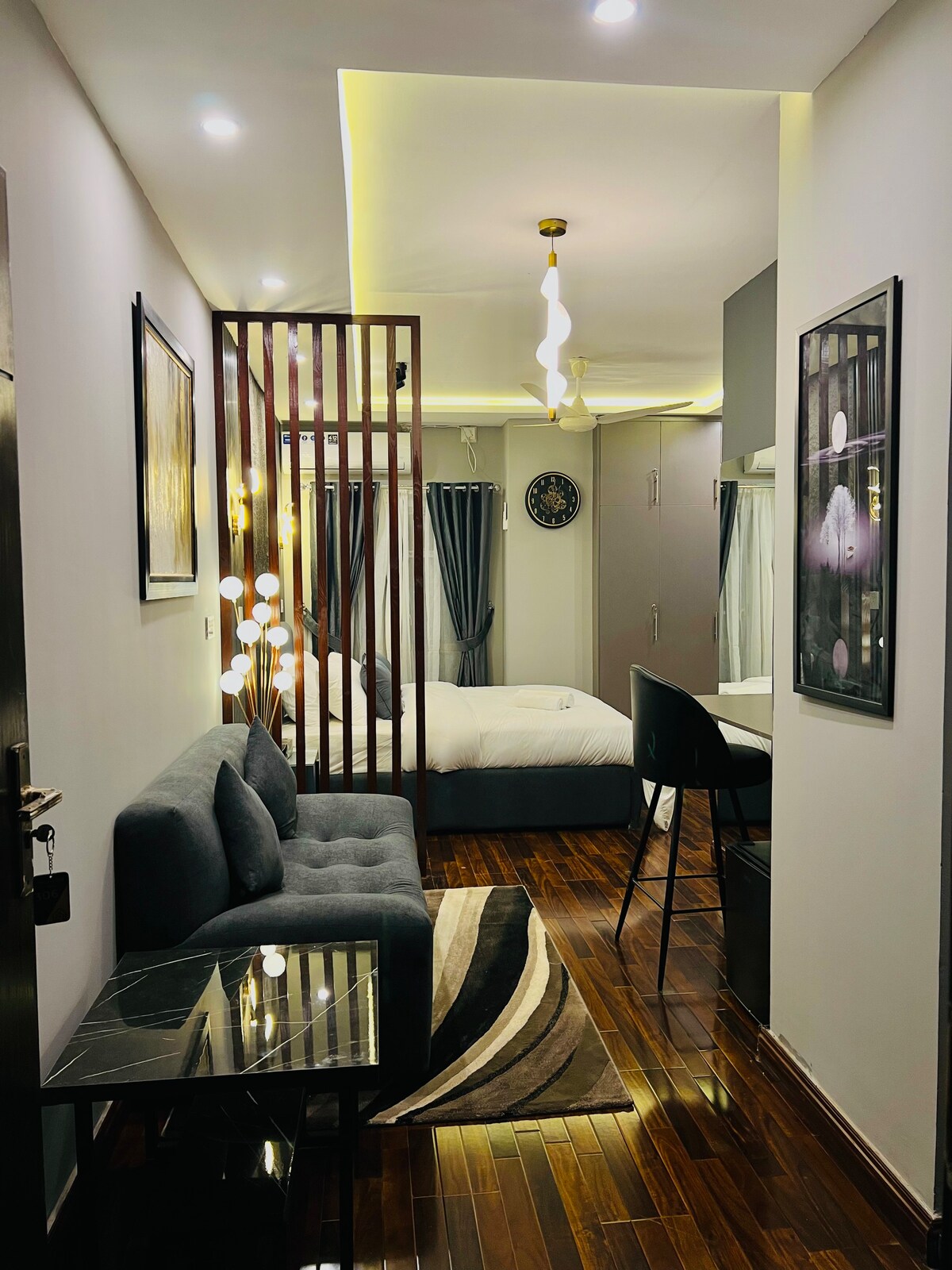 ¡Bienvenido a su retiro elegante y cómodo a 12 minutos en auto del Aeropuerto Internacional de Islamabad! Este elegante apartamento de 1 dormitorio está diseñado para viajeros de negocios y huéspedes que buscan lujo, y ofrece una mezcla de comodidad, conveniencia y sofisticación. LO más destacable del apartamento: Elegante sala de estar: muebles contemporáneos, elegante comedor y un acogedor salón para relajarse después de un largo día. Wifi rápido y Smart TV: mantente conectado y entretenido con Internet de alta velocidad y TV inteligente.