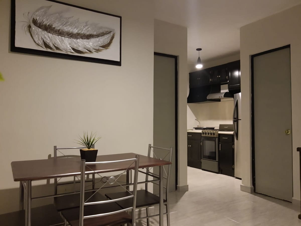 Departamento totalmente equipado ideal para una placentera estancia con todos los servicios agua caliente, tinaco, aire acondicionado(frio/calor), utensilios de cocina, electrodomésticos, servicio de entremetimiento como televisión de paga(totalplay), Internet. Cerca de centros comerciales, tiendas, fácil acceso. También contamos con cochera techada(4.10 mts. largo) con portón eléctrico para un auto mediano.