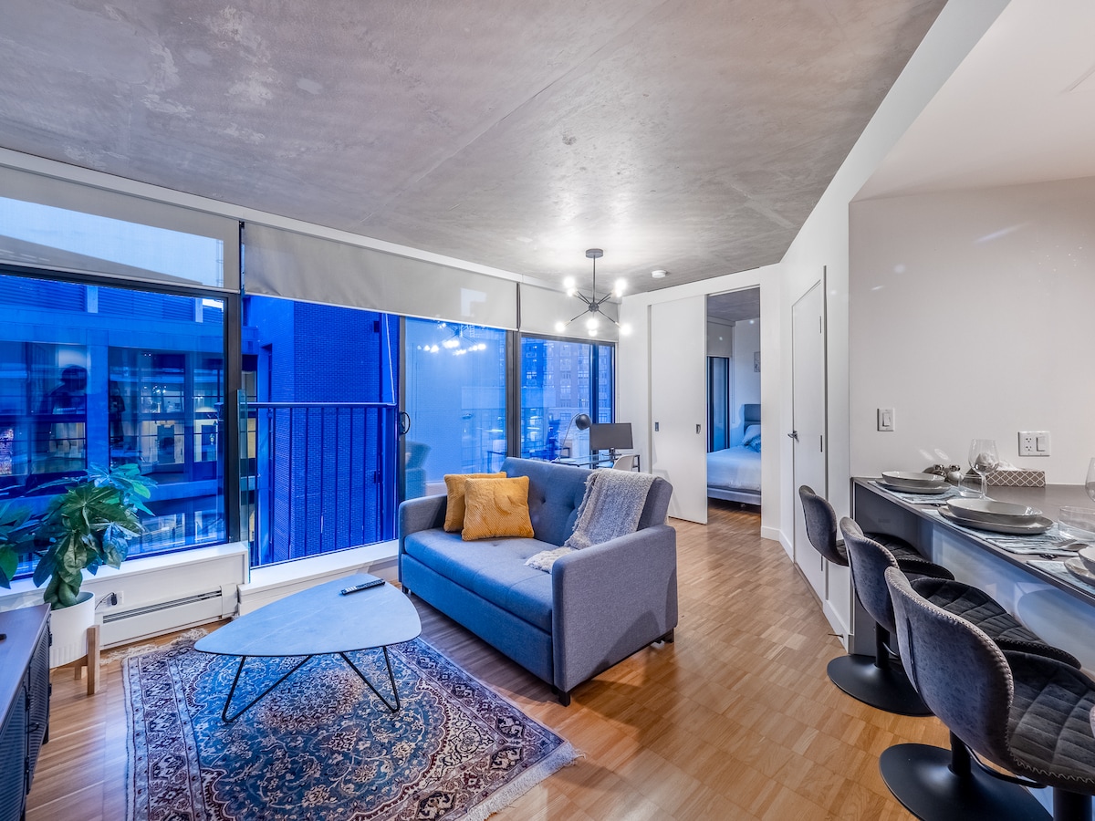 Ubicado en el icónico edificio Woodward de Vancouver, este luminoso y abierto departamento de 1.100 pies cuadrados tiene vistas panorámicas de las montañas y del puerto de Vancouver. Disfruta de tu café de la mañana en el balcón mientras sale el sol y los cruceros llegan al puerto. Sal a explorar los mejores restaurantes, patios, tiendas, teatros y eventos deportivos de Gastown, todo a pocos pasos del condominio. ¡La segunda zona de dormitorio incluye una cómoda cama tamaño queen Murphy que encaja perfectamente en el diseño abierto!