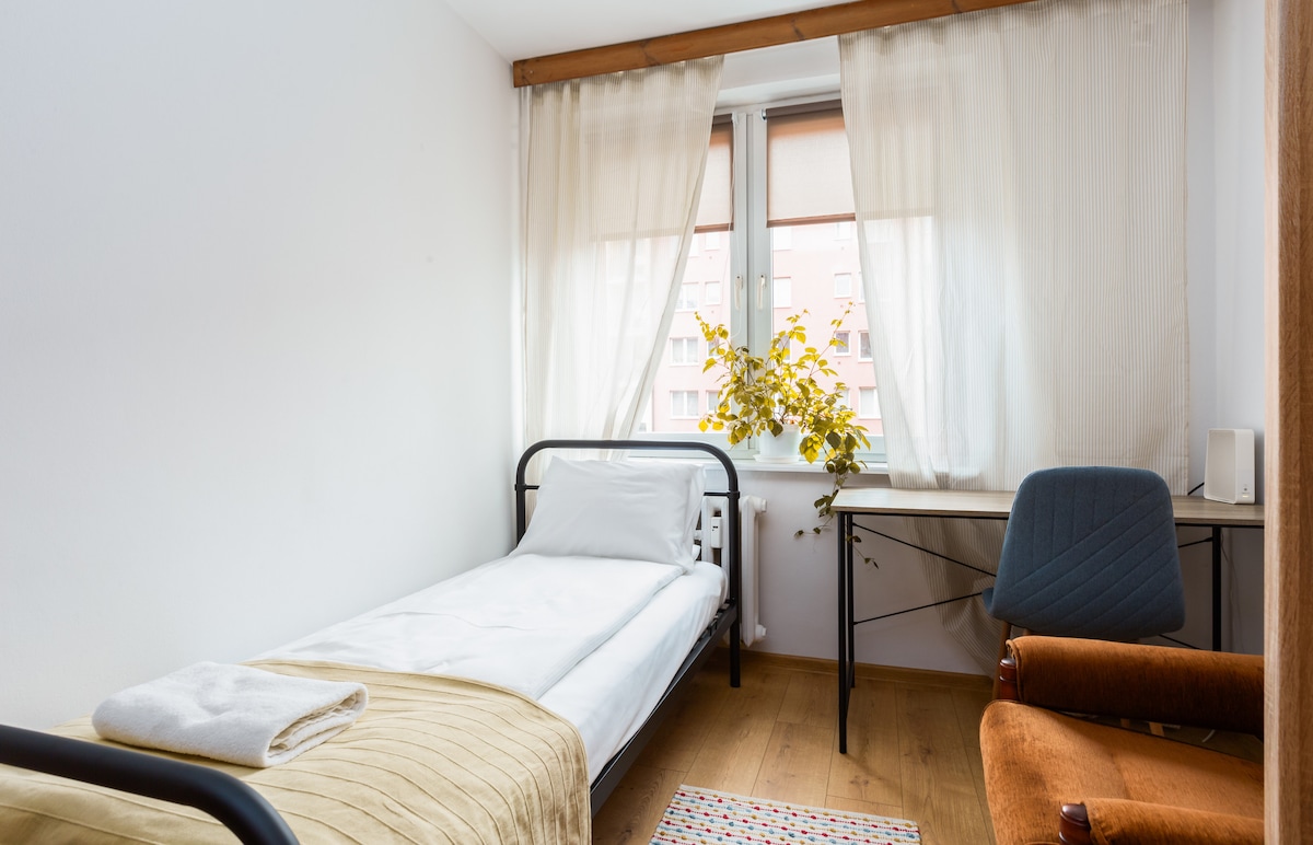 Un acogedor apartamento en el ático con hermosas vistas, en el corazón del casco antiguo. Cómodo para 1 o 2 personas, perfecto para hacer turismo, atracciones principales al alcance de tu mano WiFi, cocina equipada, nevera, lavadora, bañera, toallas. El departamento está limpio y cálido. Buena comunicación, cerca del tranvía, parada de autobús, estación de pkp y skm. Estamos disponibles todo el tiempo y estamos aquí para ayudar a nuestros huéspedes. 4. Piso sin ascensor
