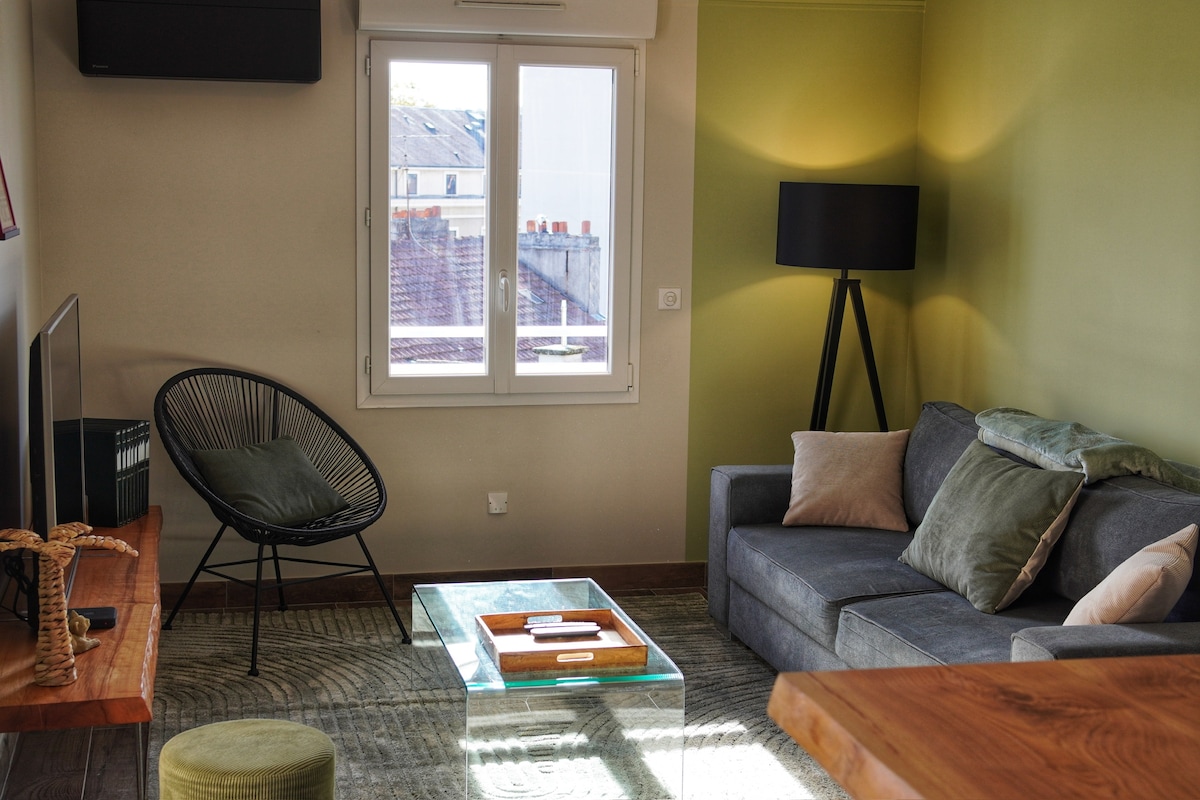 Appartement dans un petit immeuble en centre ville dans cour intérieur au 1 étage bien exposé, harmonieusement aménagé avec cuisine équipée, TV, fibre optique, récemment rénové, vu sur le jardinet zen. Le logement se situe à 5 minutes du centre ville à pied et à 8 minutes du Parc et du Palais Beaumont, toutes commodités à proximités carrefour city... la rue de l'Enfant Jésus est payante de 9h /12h30 et 14h à 18h30 sauf le dimanche pour se garer gratuitement aller sur le bld Alsace Lorraine