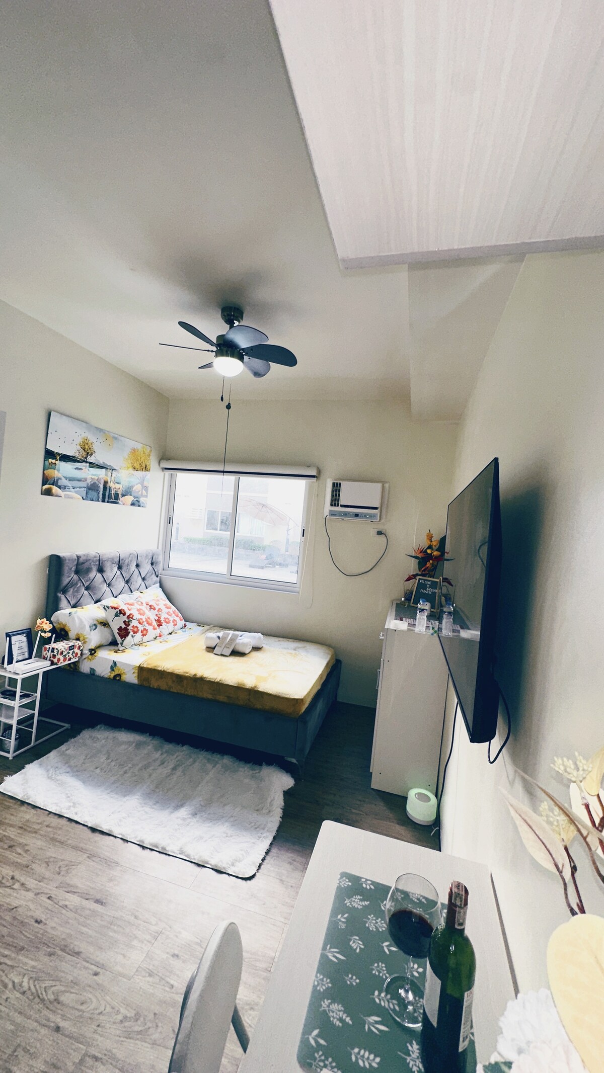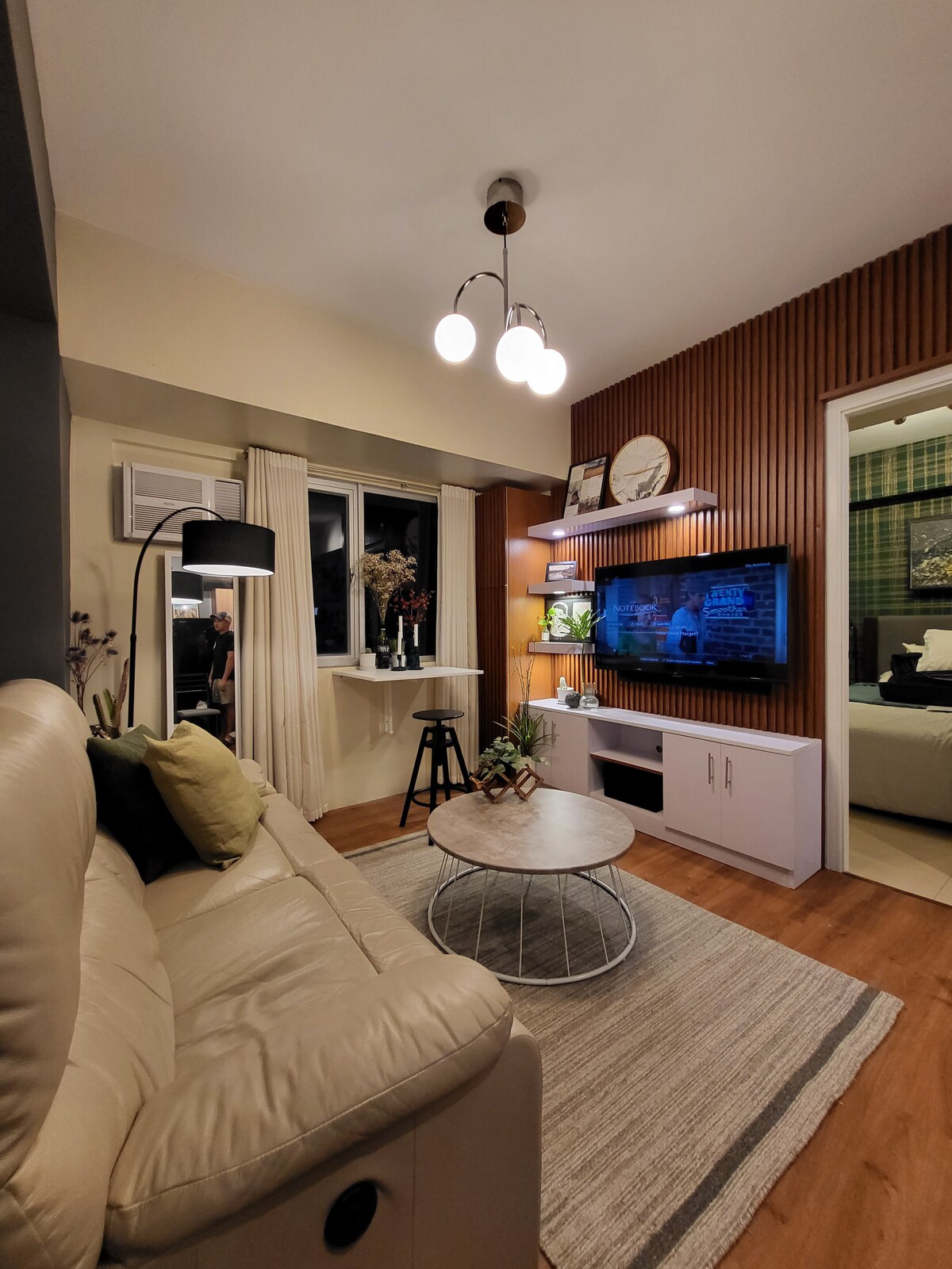 Tómate un descanso de la ciudad, dentro de la ciudad, con un presupuesto limitado. Si estás buscando un lugar acogedor para pasar tiempo de calidad con tus seres queridos sin salir de Metro Manila, este es el lugar perfecto para una estadía. Siente la brisa fresca al entrar en la puerta, recibida por pinos que traen vibraciones relajantes de Tagaytay y Baguio. La unidad cuenta con balcón, área de lavandería, utensilios de cocina, televisor inteligente de 50 pulgadas, cama tamaño king y todos los servicios que necesitas para una experiencia de estancia completa y cómoda.