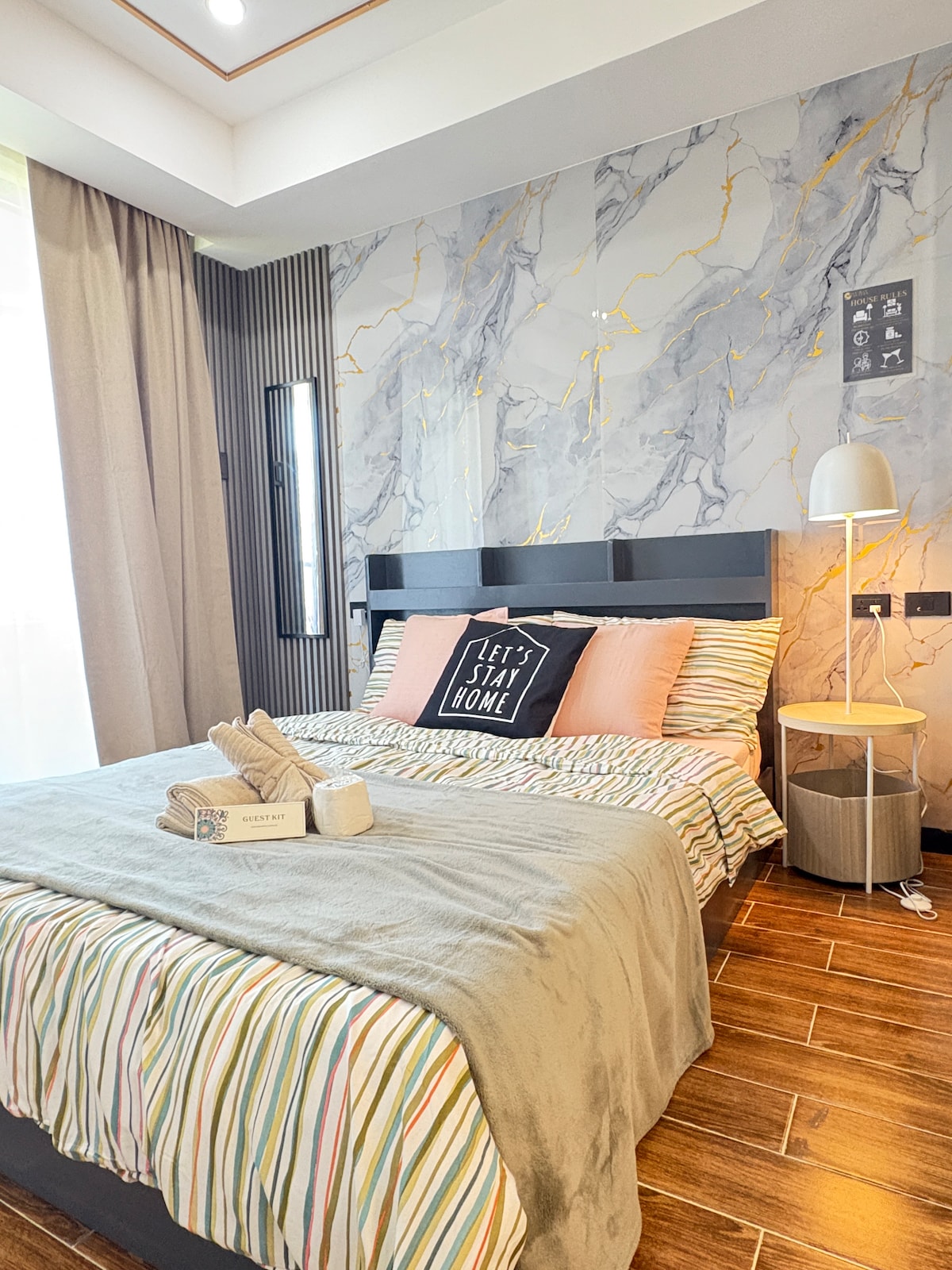 HappyStays#2 es un condominio de esquina de 30 metros cuadrados, con cama tipo loft que lo hace aún más espacioso. ¡Disfruta de BED CINEMA en nuestro televisor grande de 65 pulgadas conectado a wifi rápido de 300 mbps, con Netflix, HBO, Prime y Disney! La vista de la ventana desde el sexto piso es el hermoso horizonte y las exuberantes zonas verdes. Tiene 3 camas (sofá cama tamaño queen y cama alta) y comodidades de cocina completas. Tiene lavadora y dispensador de agua eléctrico (con 3 galones de agua redondos) para una máxima comodidad hogareña. Está ubicado junto al centro comercial SM Mall.