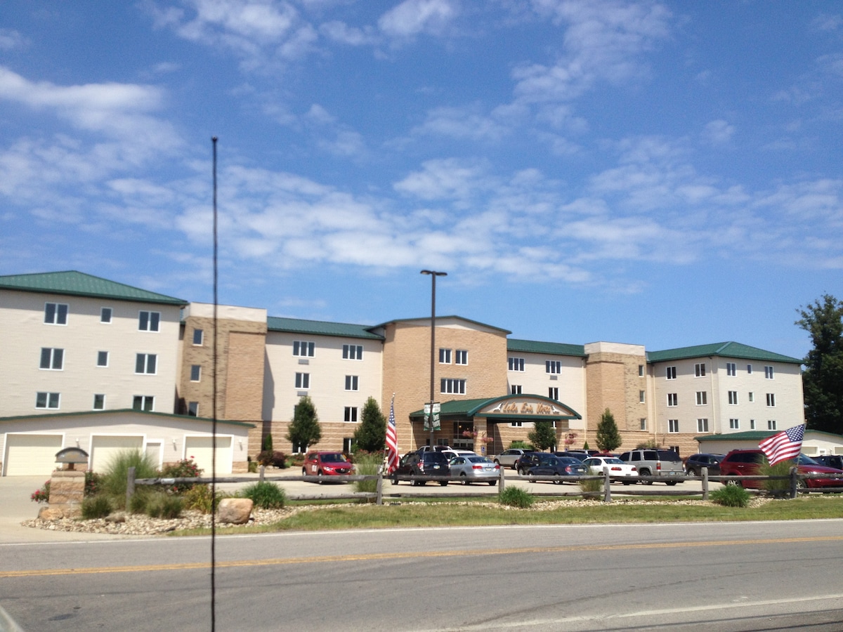 ¡El alojamiento n.º 309 es un apartamento frente al lago con un balcón de 15 pies con las vistas más espectaculares! TV inteligente, cable, wifi gratuito. LAKE ERIE VISTA CONDOMINIUMS ofrece ascensores, piscina cubierta climatizada, playa privada, fogatas y parrillas al aire libre... ¡y a solo minutos de la famosa Strip en Geneva-on-the-Lake y de las bodegas locales! Perfecto para familias o para una escapada de fin de semana de chicas. Te proporcionamos todo lo necesario para que tu viaje sea lo más fácil de preparar posible. Debbie White, gerente de alquileres