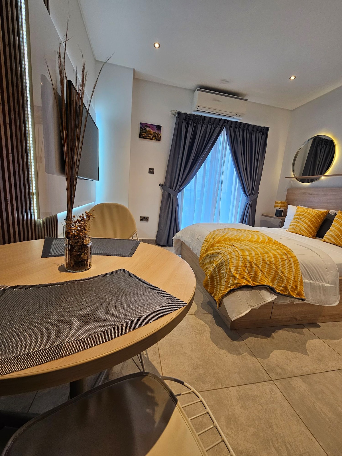 Nuestro estudio compacto ofrece la mezcla perfecta de comodidad y conveniencia en una ubicación privilegiada. Ubicado en el vibrante corazón de Accra, tendrás acceso a todo. Entra en nuestro encantador estudio en el octavo piso, donde te espera una mezcla de calidez y estilo. Los detalles cuidadosamente seleccionados, incluida la cocina pequeña totalmente equipada, crean un ambiente acogedor, que te permite relajarte y relajarte. Por último, las impresionantes vistas. Disfruta de un cóctel nocturno en el balcón o en Enigma Sky Lounge en la azotea.