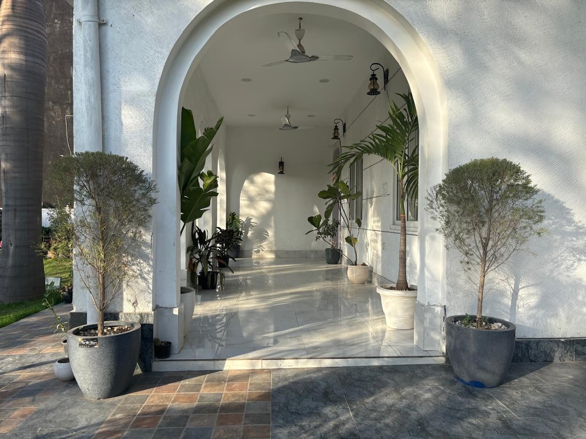 Relájate y rejuvenece con la vista a la piscina/fuente, jardín de palmeras, vista al amanecer desde las habitaciones, jardín zen para meditación y yoga. La estancia incluye: 2 habitaciones con baños adjuntos, sala de servicio con inodoro, espacio de lavandería cubierto y cocina modular de 100 pies cuadrados junto con electrodomésticos de última generación. Todos los servicios están cubiertos en un área de 5000 pies cuadrados. Exuberante jardín verde rodeado por un sendero diseñado específicamente para activar los puntos de acupresión y columpio de madera. Terraza para observar las estrellas. Conectividad con el metro y cafetería.
