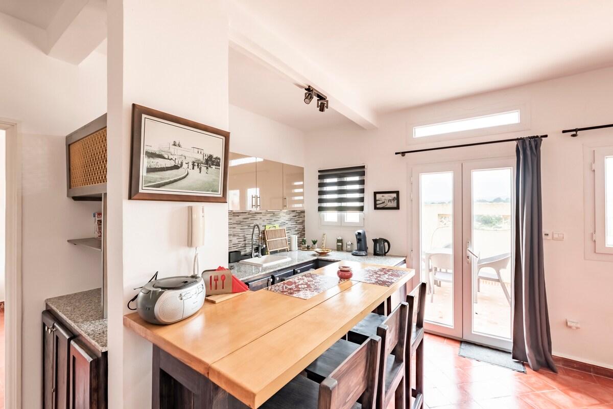 Wooden Heaven es un apartamento con una temática única en el centro de Esauira, con un diseño abierto y una amplia terraza con magníficas vistas panorámicas a toda la ciudad. Con su énfasis en la madera, el interior irradia calidez y encanto, ofreciendo un retiro sereno. Los huéspedes pueden disfrutar de vistas de casi 360 grados, perfectas para presenciar impresionantes amaneceres y atardeceres. Este apartamento promete una estancia verdaderamente excepcional, combinando el confort moderno con vistas incomparables del vibrante paisaje urbano de Esauira.