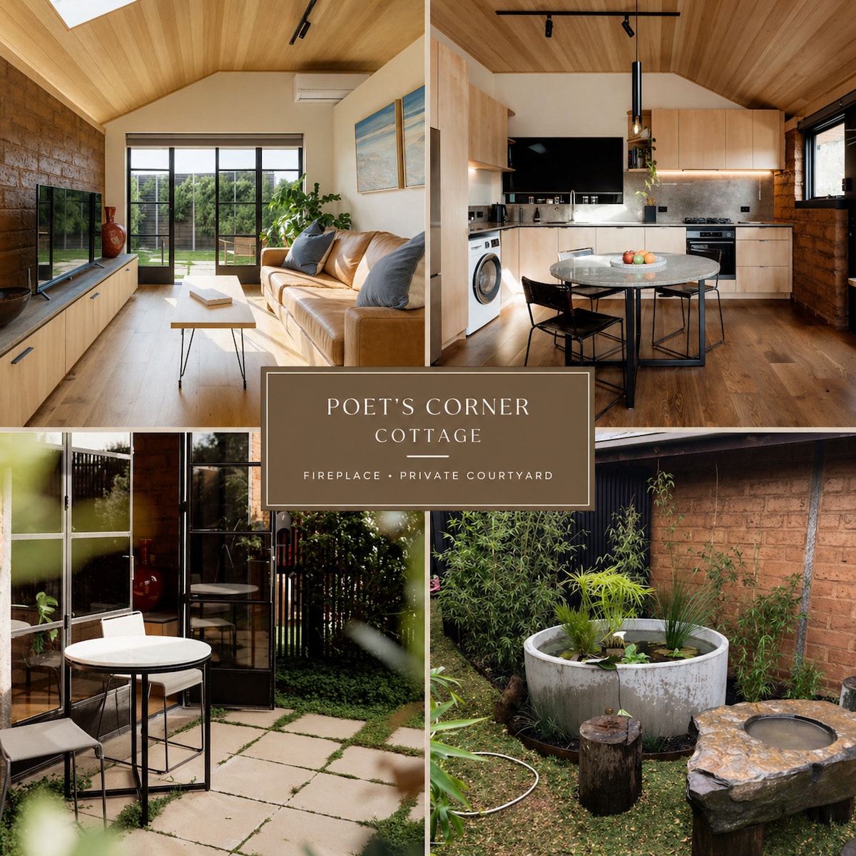 Relájate en nuestra encantadora cabaña Poet's Corner en Phillip Island, donde la comodidad refinada se mezcla sin esfuerzo con el encanto junto a la playa. Este acogedor refugio ofrece una lujosa cama tamaño queen, una cocina moderna totalmente equipada, una elegante chimenea y un jardín aislado acentuado por una relajante fuente de agua. Con animados cafés cerca y senderos costeros impresionantes a poca distancia, es un refugio ideal para los huéspedes que desean relajarse y explorar. Cada espacio refleja una artesanía cuidadosa.