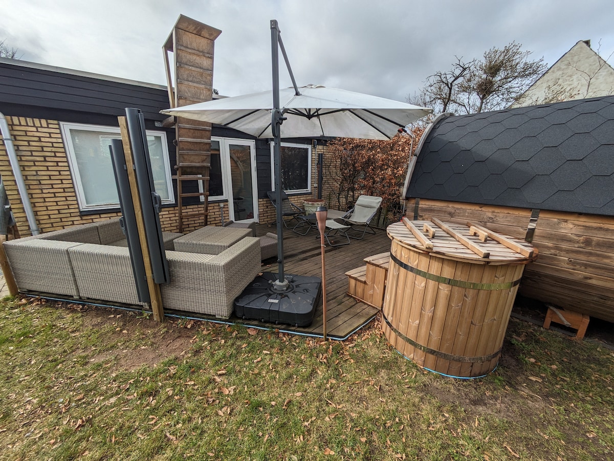 Deja que este sea tu centro de bienestar cerca de Copenhague. Se accede a la sauna eléctrica al aire libre y al chapuzón en frío a través del dormitorio principal (cama doble) + baño propio. Hay una litera (70 x 160 cm) y un espacio creativo en la habitación de los niños. El segundo baño tiene bañera y se accede desde el amplio comedor + sala de estar. La acogedora cocina abierta completa el espacio social. El jardín privado también invita a la relajación. El gato es amigable (puerta propia, comida y agua automáticas). A 10 minutos a pie del tren.