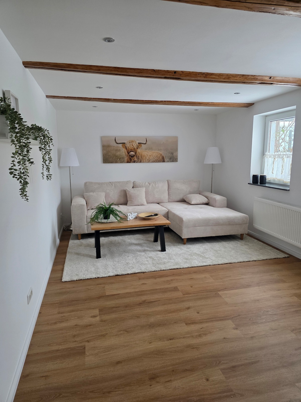 Debajo de las vigas hay un apartamento completamente renovado con vigas de madera visibles, un estilo de casa de campo luminoso y un ambiente cálido. Además de la calefacción de gas, una estufa proporciona un calor acogedor. El departamento está completamente amueblado, es apto para perros e ideal para huéspedes que lo prefieran acogedor y auténtico. El área al aire libre se rediseñará durante los meses de verano. ¡Ubicación tranquila en Angerstein para desconectar y llegar puro!