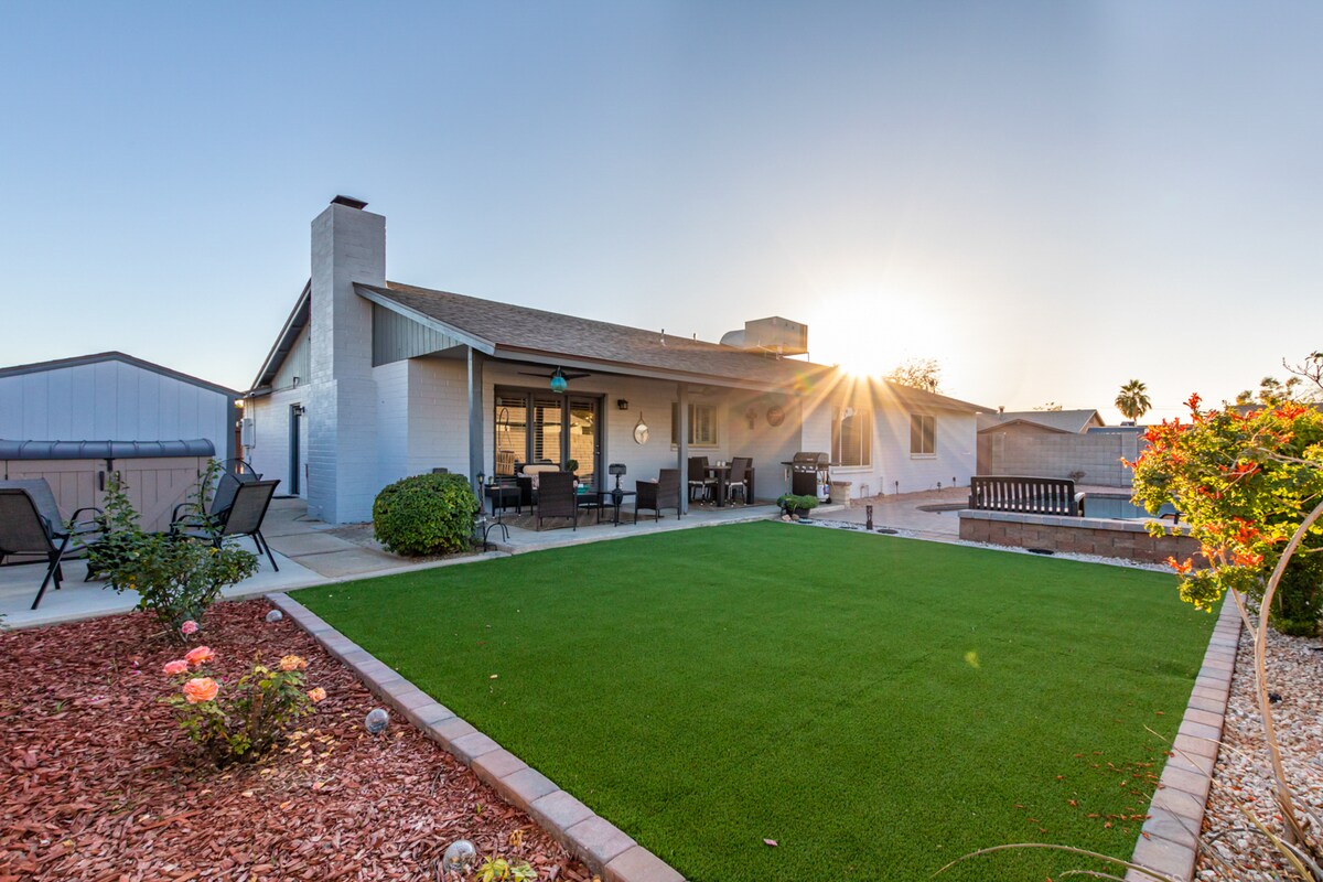 Welcome to the Handcrafted Home in the desert. There is a large outdoor area with a heated pool, bbq, and propane fire table. The heating of the pool is included in the cost of your stay from October-May. You will enjoy entertaining in the fully equipped chef’s kitchen with updated appliances and an air fryer in the oven. The comfy beds are memory foam and the bathrooms are both updated. Skip the game day/concert traffic and opt for an easy walk. We are located 0.8 miles from State Farm Stadium.