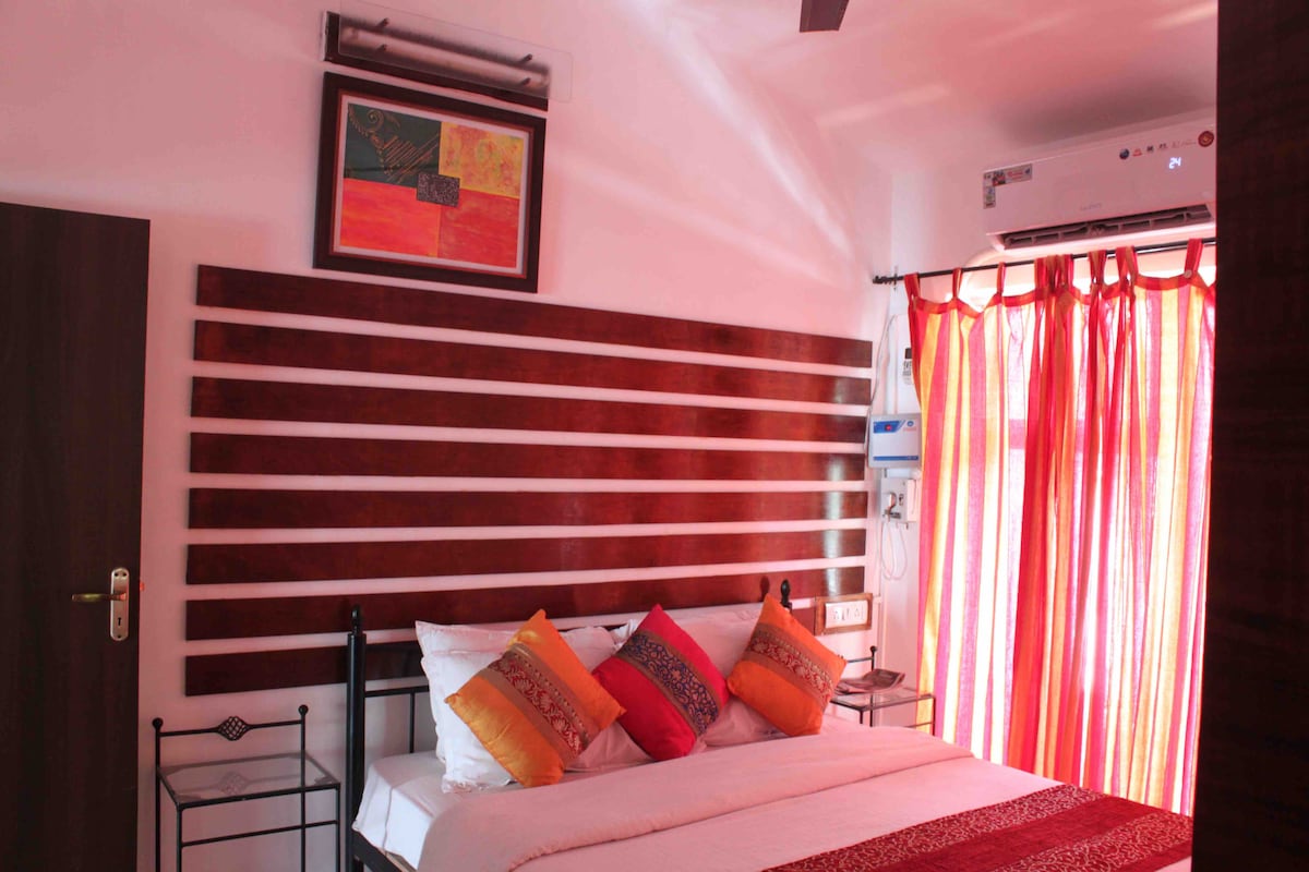 Modern Boho Apartment | Minutes from North Goa's Beaches.A cozy, fully furnished 1BHK retreat on ground floor perfect for couples, friends, or small families. Highlights: - Stylish boho interiors with a warm vibe - AC in bedroom & living room for comfort - Smart TV + High-speed WiFi - Equipped kitchen with RO water, cooktop, fridge & washing machine - Shared swimming pool (9 AM–6 PM | swimwear mandatory - On-site gym available at INR 200/-per person per day - 24/7 security - Free Parking