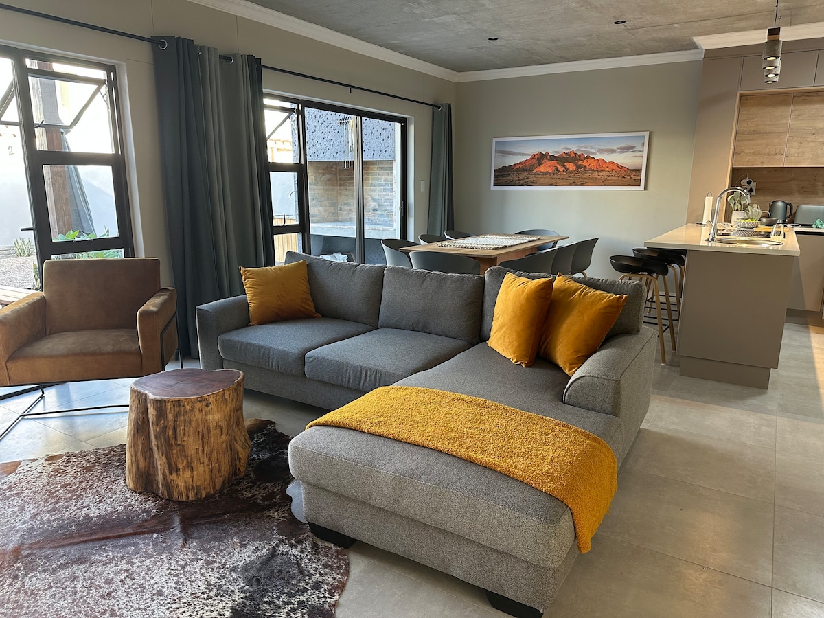 A beautiful sunny apartment situated right on the glorious Namib Desert with a breathtaking view of the dunes, riverbed and, in the distance, the Atlantic Ocean. Watch the sun rise over the dunes and set over the ocean for the perfect stay in Swakopmund!