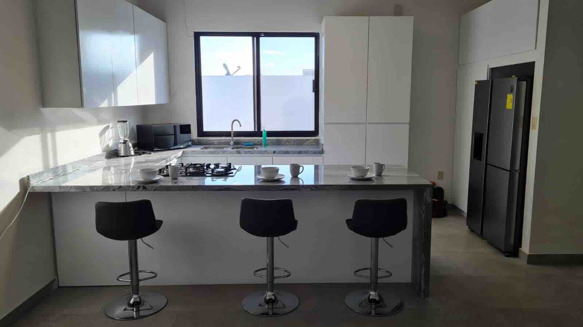 Amplio y cómodo departamento zona Residencial , segunda planta, para 6 personas, moderno con desniveles en su interior, cuenta con 3 habitaciones, 2 baños completos y 1 de tocador, cocina con todos los utencilios necesarios, sala, comedor, barra desayunadora, cuenta con clima frío y calor, cable, wifi, terraza con asador, camara de seguridad afuera, cochera para 1 carro, el alojamiento se encuentra en un lugar muy centrico, para estancias de mas de dos semanas se cobrará limpieza cada 7 dias.