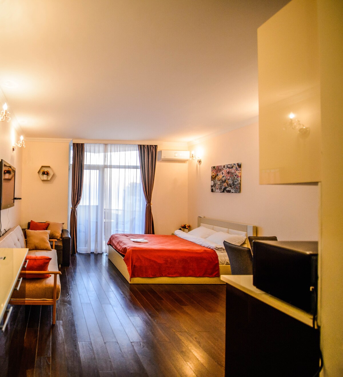 Despiértate con vistas panorámicas al mar en este estudio recientemente renovado en la Torre Porta Batumi. Ubicado entre el casco antiguo y la playa, el apartamento ofrece un diseño elegante, electrodomésticos modernos y un televisor inteligente. Tiene capacidad para un máximo de 3 huéspedes. ¡El lugar perfecto para una escapada con estilo en Batumi!