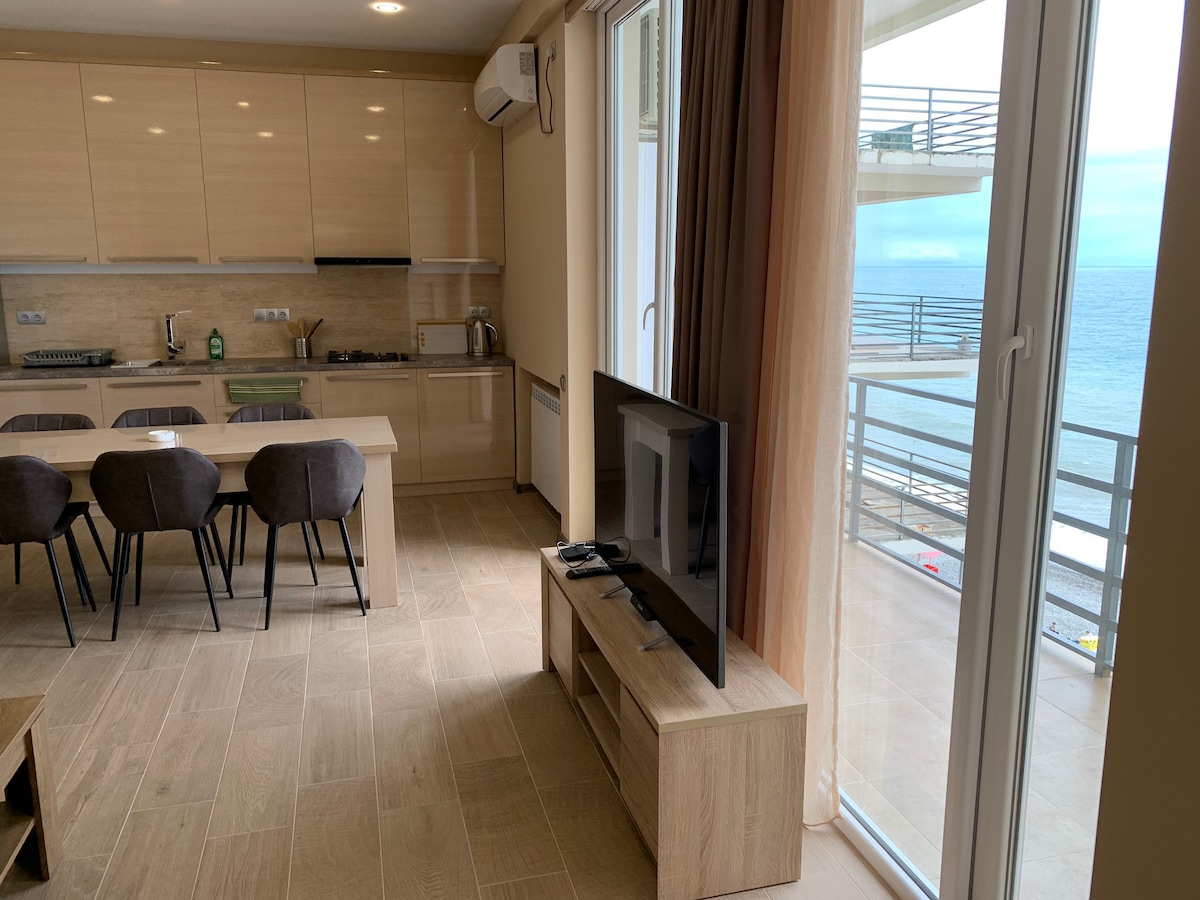 Apartamento a estrenar situado a pie de playa, debajo de las montañas. Todas las habitaciones tienen balcones con una fantástica vista al mar, mucha luz y espacio. El apartamento tiene cocina equipada, 2 dormitorios (uno con cama de matrimonio y otro con 2 camas individuales) y 1 sala de estar con sofá convertible. Wifi gratuito de alta velocidad, TV por cable de pantalla plana, lavadora y secadora, aire acondicionado y calefacción para estancias durante todo el año. Aparcamiento gratuito, mercado, parque infantil, billar y restaurante disponibles en la planta baja.
