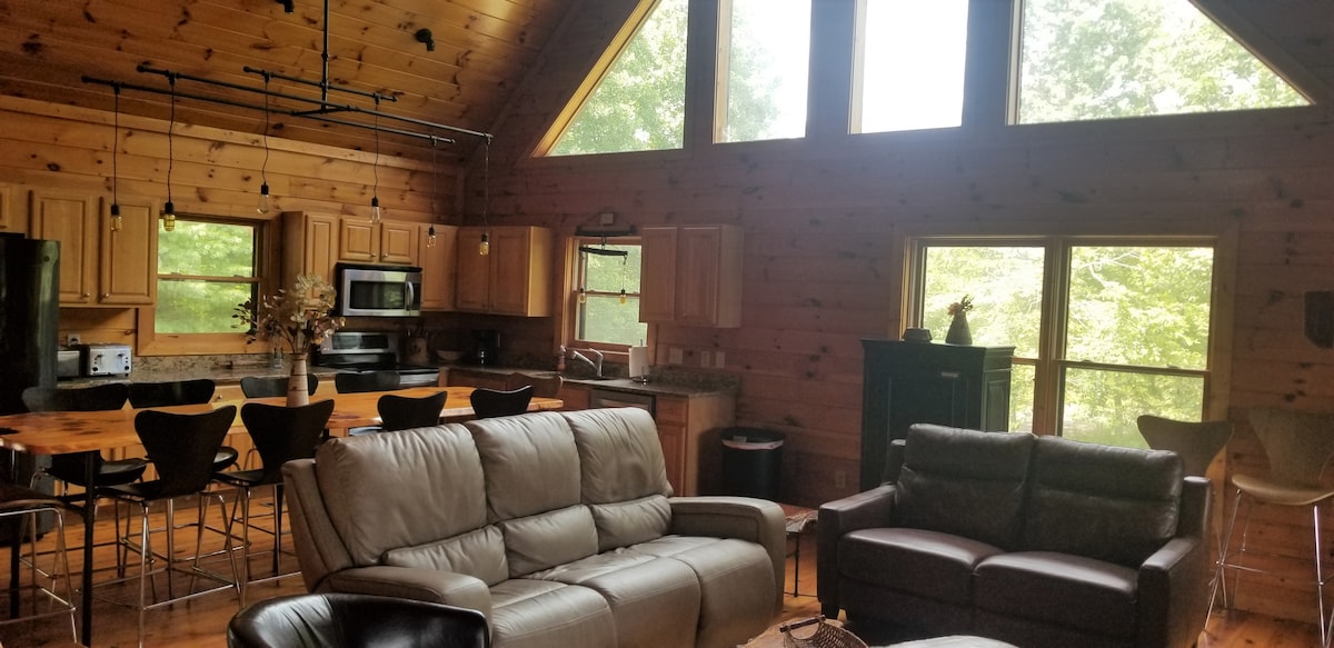 Come stay in a riverfront cabin in the gorgeous N. GA mountains! Located 20 mins from Carters lake + 30 mins from Ellijay! Brand new, clean & modern barndominium style home located in a gated resort community far away from all other homes! River access right in backyard is great for bass fishing + access to private community fishing lake, beach area, hiking trails and swimming pools! Close to vineyards, breweries, waterfalls! Enjoy the peace & quiet! *Please read house rules before booking!*