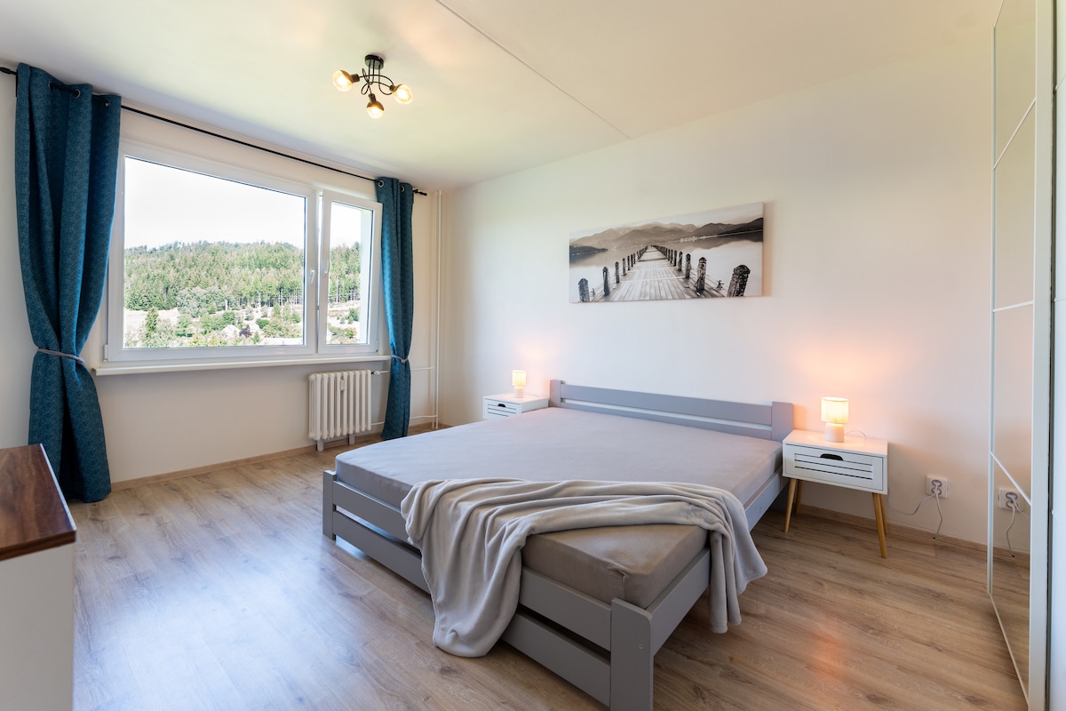 El apartamento está situado en una muy buena ubicación en una casa familiar. El centro de la ciudad está a unos 10 minutos a pie. Hay una parada de transporte público justo delante de la casa. Muy cerca también se encuentra la popular presa de Jablonec, que se puede utilizar tanto en verano como en invierno (bicicleta, patines, natación, paddleboard, etc.) La estación de tren está a unos 3 minutos a pie. Hay muchos lugares geniales para ver en los alrededores y es un gran lugar para comenzar un viaje. Tiendas de comestibles también muy cerca. (5 min. En invierno, la pista de esquí más cercana está a 15 minutos en coche. Aparcamiento gratuito delante de la casa. Las mascotas no son un problema.