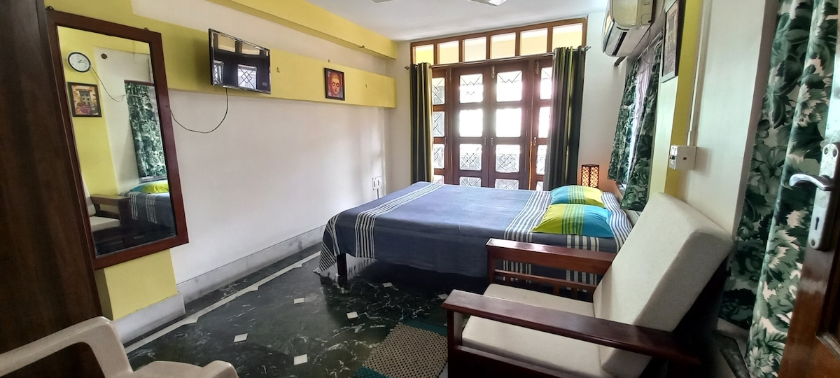 Olvídate de las preocupaciones en este gran alojamiento: ¡es un oasis de tranquilidad! Una residencia vintage de un dormitorio en la planta baja en una casa de 2 plantas con baño privado, cocina, comedor y un gran balcón. Adecuado para mujeres que viajan solas, profesionales, turistas, estudiantes, parejas casadas o no casadas y huéspedes LGBTQ. Excelente ubicación, justo al final de la calle desde South City Mall, la Universidad de Jadavpur, el Hospital AMRI y muchos otros lugares populares con buena disponibilidad de transporte.