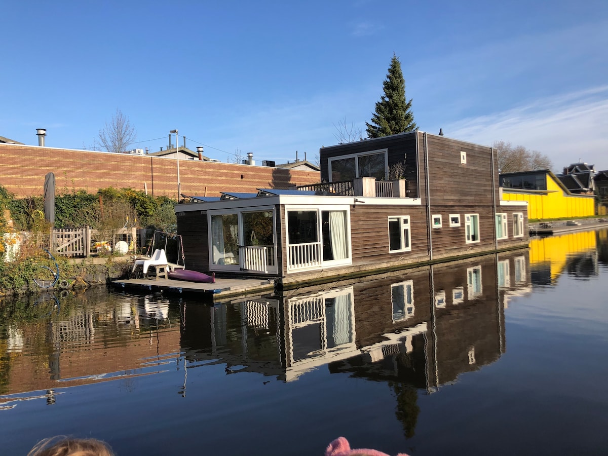 ¡Ven y alójate en una casa flotante! Ofrecemos una casa de huéspedes privada con un gran comedor/sala de estar (incluye un cómodo sofá cama para 2) y un baño separado arriba. Abajo una cama tamaño queen con vistas al agua y baño con ducha y bañera grande. Una terraza en frente con varios asientos y un banco columpio. Situado en una hermosa calle verde muy cerca del centro: a 2 paradas en tranvía o a 15 minutos a pie de la estación central. No servimos desayuno, pero ofrecemos muchos elementos básicos agradables para preparar el tuyo.