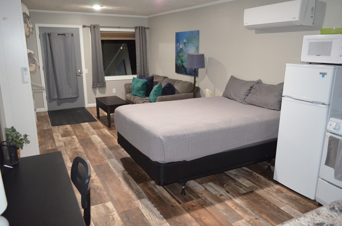 Everything you need to relax & recharge in one cozy space. Private entrance. This suite is an open floor plan with a small kitchenette that includes a fridge, microwave and stove with basic kitchen utensils and dishes. It is located in town close to stores, restaurants. Nice patio out back with covered area to grill out. Walking distance to the North Country Trail and 10 min from the new Dragon trail. There is one queen bed and a couch. It will comfortably sleep two guest.