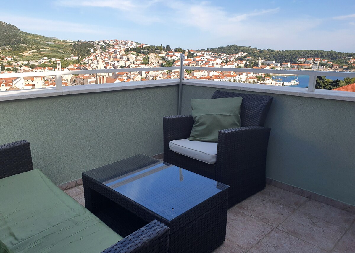 Amplio apartamento privado con cocina, bien equipado para preparar comidas, baño privado, dormitorio para dos personas y un gran balcón con vistas al mar, a las islas Pakleni y a las islas de Vis y Korčula. La hermosa puesta de sol hace de este un lugar perfecto para terminar el día. Wifi gratuito, aire acondicionado, plaza de aparcamiento, lavandería y mucho más, además de excelentes consejos de tu anfitrión (un lugareño) para descubrir Hvar. :) ¡Ven a relajarte y disfrutar de la ciudad de Hvar!