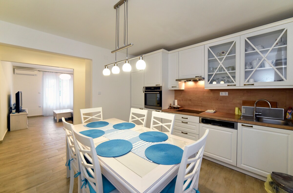 Hay un apartamento más grande, un apartamento más pequeño y un estudio. Los apartamentos están recién decorados, con espacios de estacionamiento seguros, en el centro . Cerca del puerto deportivo ACI, campo de fútbol, escuela, playa a 200 metros de distancia. Posibilidad de utilizar la barbacoa en el patio exterior. Los apartamentos tienen vistas al mar y desde los dormitorios y desde la estancia. Cada habitación tiene su propio balcón y baño privado. Estancia que incluye mesa de comedor en la cocina y terraza con vistas al mar. Se admiten mascotas por una tarifa adicional